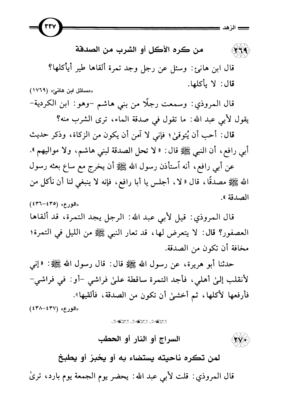 270 - السراج أو النار أو الحطب لمن تكره ناحيته يستضاء به أو يخبز أو يطبخ