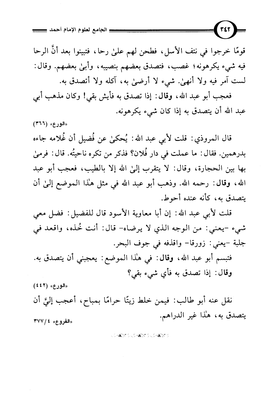 فعجب أبو عبد اللَّه، وقال: إذا تصدق به فأيش بقي! وكان مذهب أبي عبد اللَّه أن يتصدق به إذا كان شيء يكرهونه.