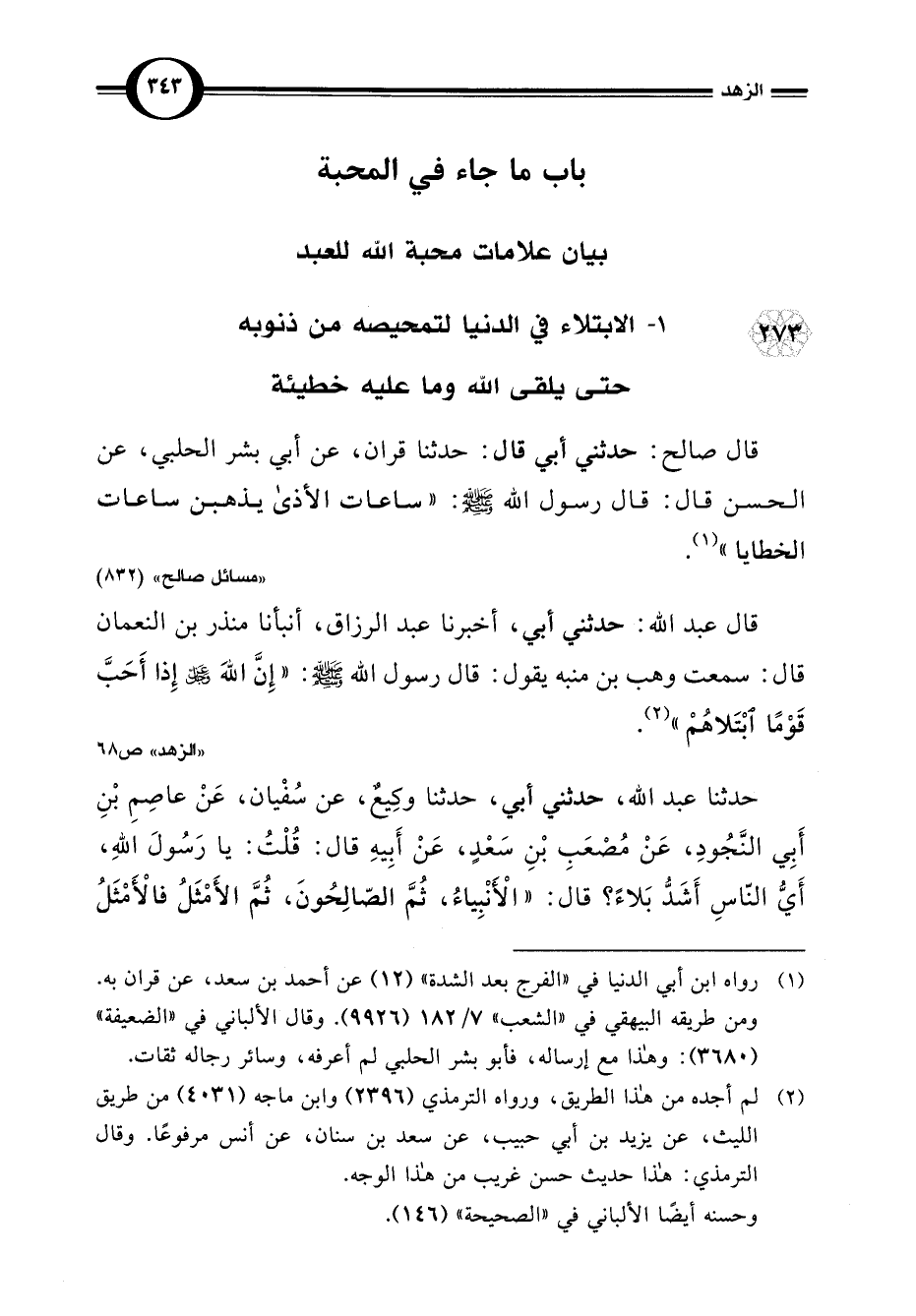 قال عبد اللَّه: حدثني أبي، أخبرنا عبد الرزاق، أنبأنا منذر بن النعمان قال: سمعت وهب بن منبه يقول: قال رسول اللَّه -صلى اللَّه عليه وسلم-: "إِنَّ اللَّه عز وجل إِذا أَحَبَّ قَوْمًا ابْتَلاهُمْ" (¬2).