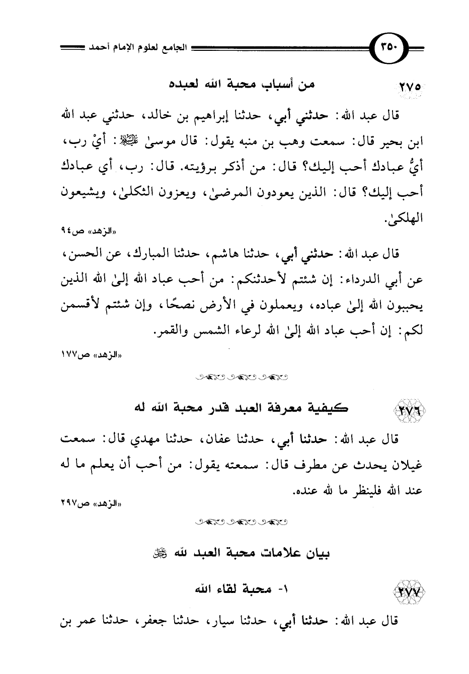 قال عبد اللَّه: حدثني أبي، حدثنا إبراهيم بن خالد، حدثني عبد اللَّه ابن بحير قال: سمعت وهب بن منبه يقول: قال موسى عليه السلام: أيْ رب، أيُّ عبادك أحب إليك؟ قال: من أذكر برؤيته. قال: رب، أي عبادك أحب إليك؟ قال: الذين يعودون المرضى، ويعزون الثكلى، ويشيعون الهلكى.