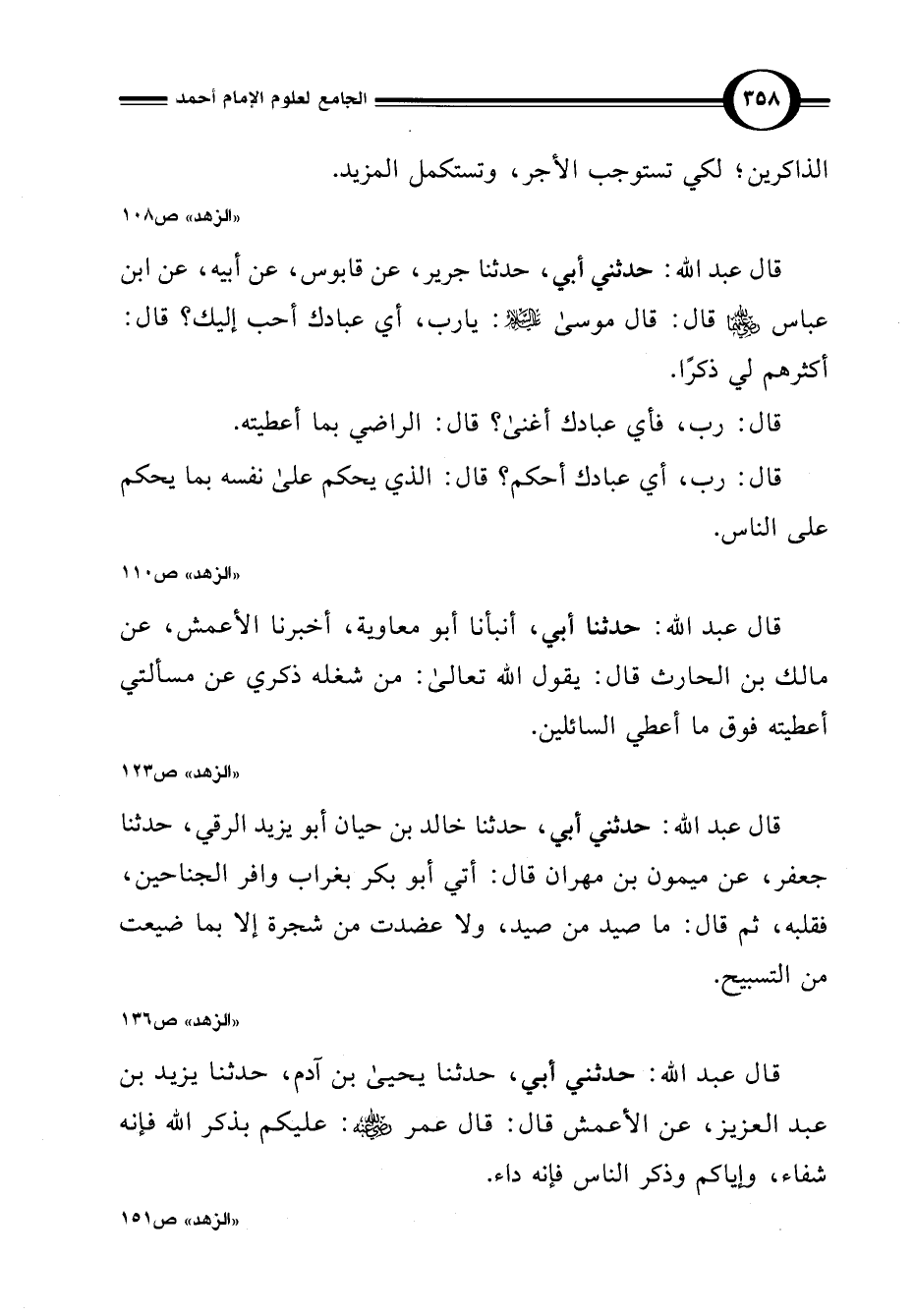 قال عبد اللَّه: حدثني أبي، حدثنا جرير، عن قابوس، عن أبيه، عن ابن عباس -رضي اللَّه عنهما- قال: قال موسى عليه السلام: يا رب، أي عبادك أحب إليك؟ قال: أكثرهم لي ذكرًا.