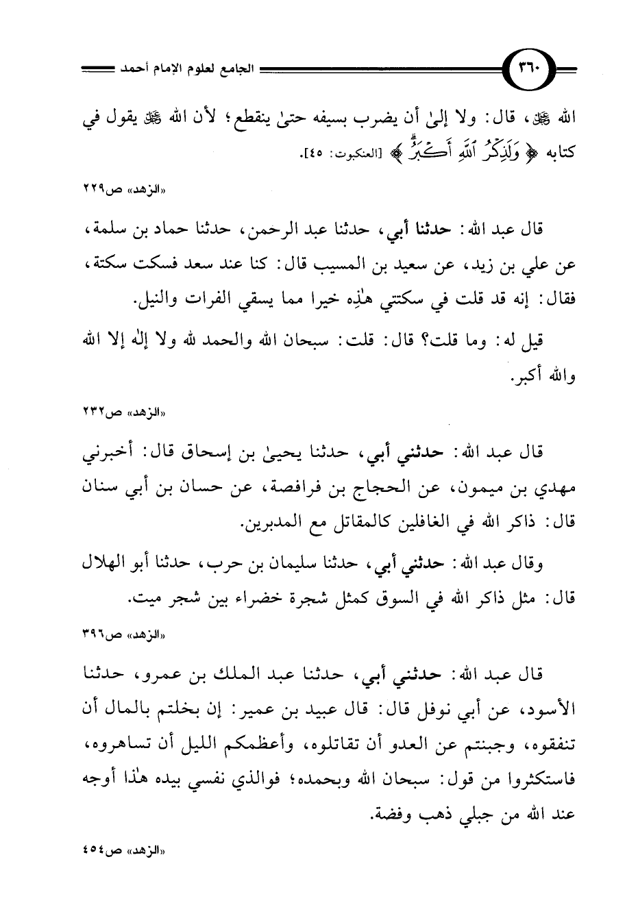 قال عبد اللَّه: حدثني أبي، حدثنا عبد الملك بن عمرو، حدثنا الأسود، عن أبي نوفل قال: قال عبيد بن عمير: إن بخلتم بالمال أن تنفقوه، وجبنتم عن العدو أن تقاتلوه، وأعظمكم الليل أن تساهروه، فاستكثروا من قول: سبحان اللَّه وبحمده؛ فوالذي نفسي بيده هذا أوجه عند اللَّه من جبلي ذهب وفضة.