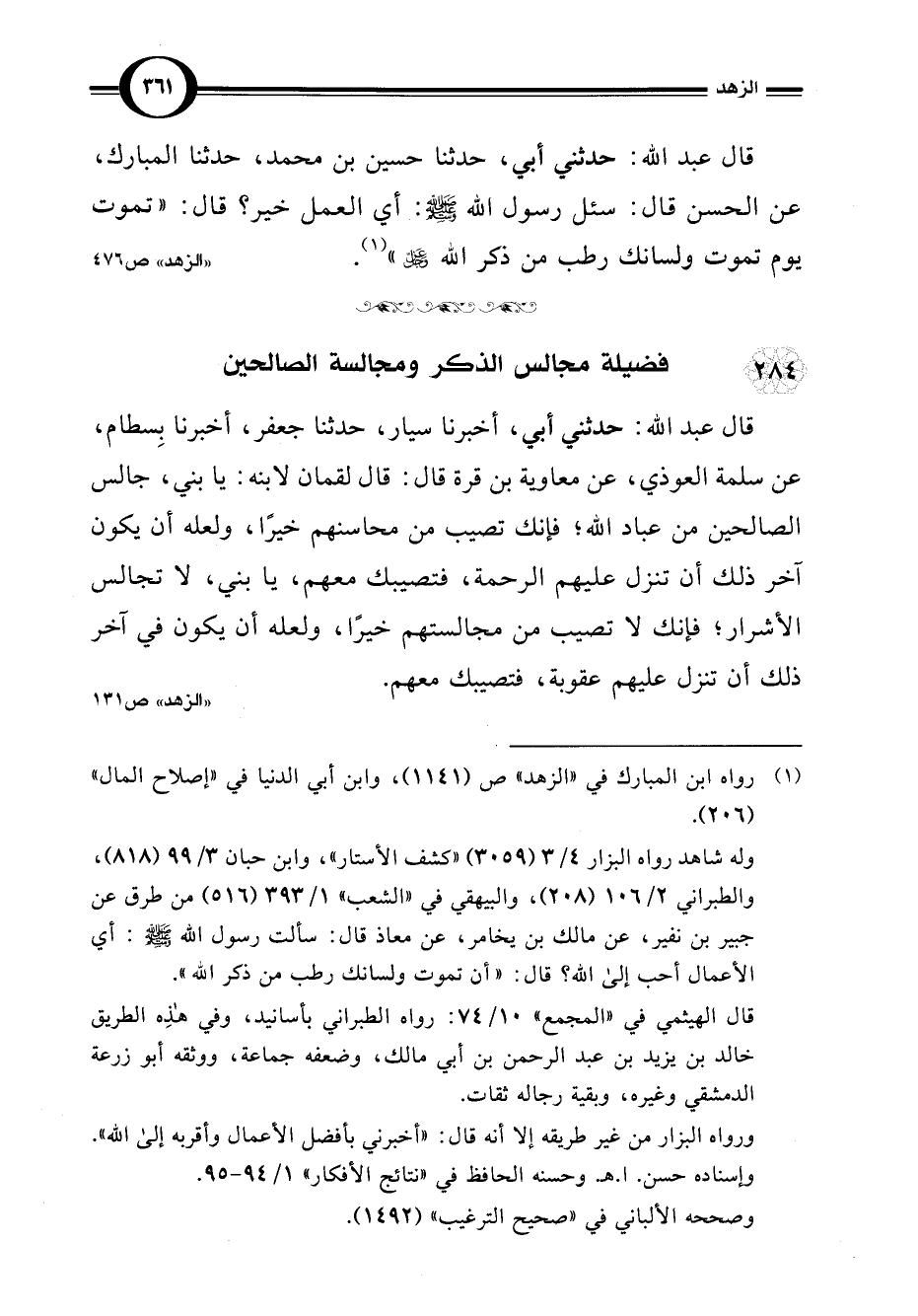 قال عبد اللَّه: حدثني أبي، حدثنا حسين بن محمد، حدثنا المبارك، عن الحسن قال: سئل رسول اللَّه -صلى اللَّه عليه وسلم-: أي العمل خير؟ قال: "تموت يوم تموت ولسانك رطب من ذكر اللَّه عز وجل" (¬1).
