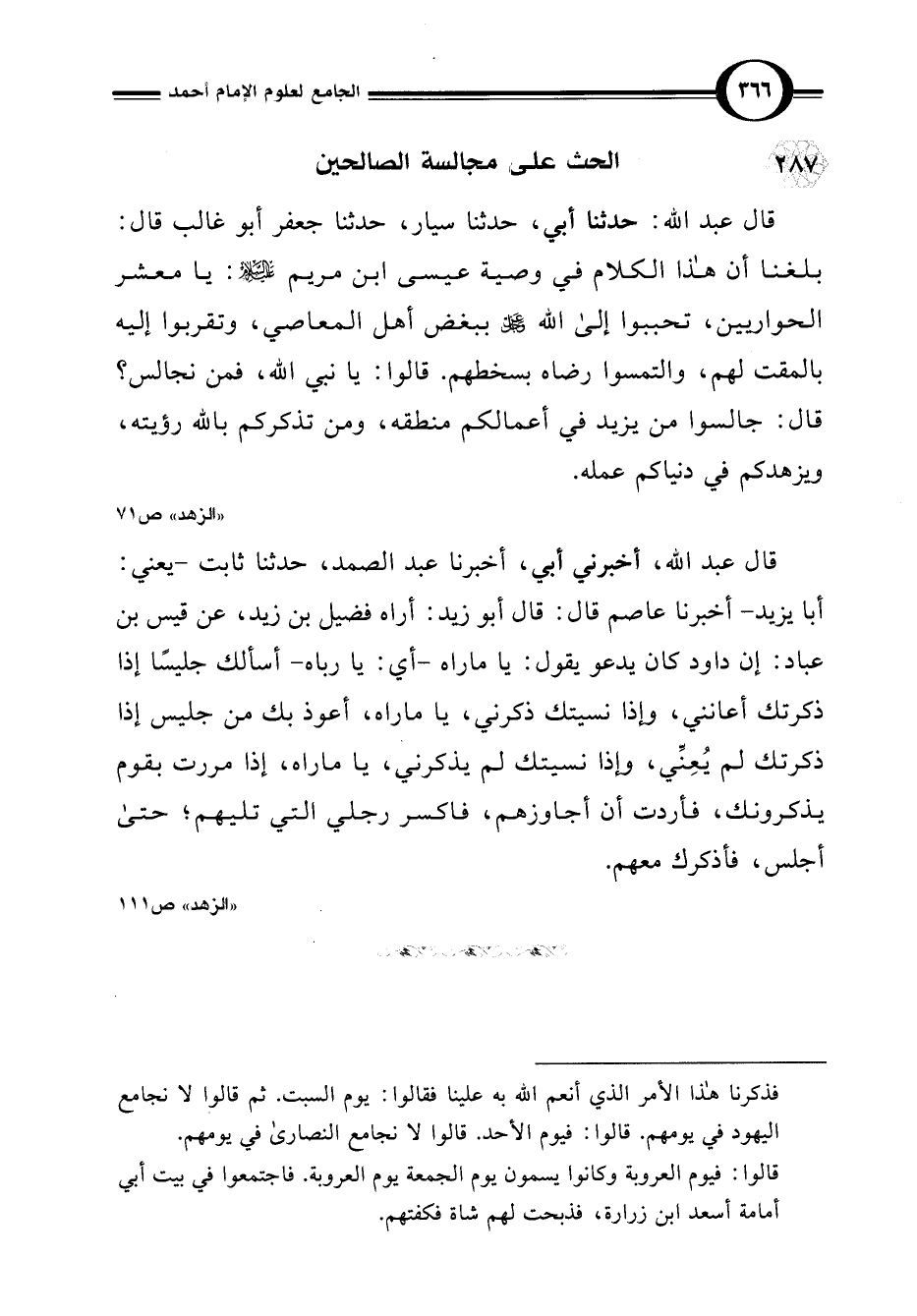 قال عبد اللَّه، أخبرني أبي، أخبرنا عبد الصمد، حدثنا ثابت -يعني: أبا يزيد- أخبرنا عاصم قال: قال أبو زيد: أراه فضيل بن زيد، عن قيس بن عباد: إن داود كان يدعو يقول: يا ماراه -أي: يا رباه- أسألك جليسًا إذا ذكرتك أعانني، وإذا نسيتك ذكرني، يا ماراه، أعوذ بك من جليس إذا ذكرتك لم يُعِنِّي، وإذا نسيتك لم يذكرني، يا ماراه، إذا مررت بقوم يذكرونك، فأردت أن أجاوزهم، فاكسر رجلي التي تليهم؛ حتى أجلس، فأذكرك معهم.