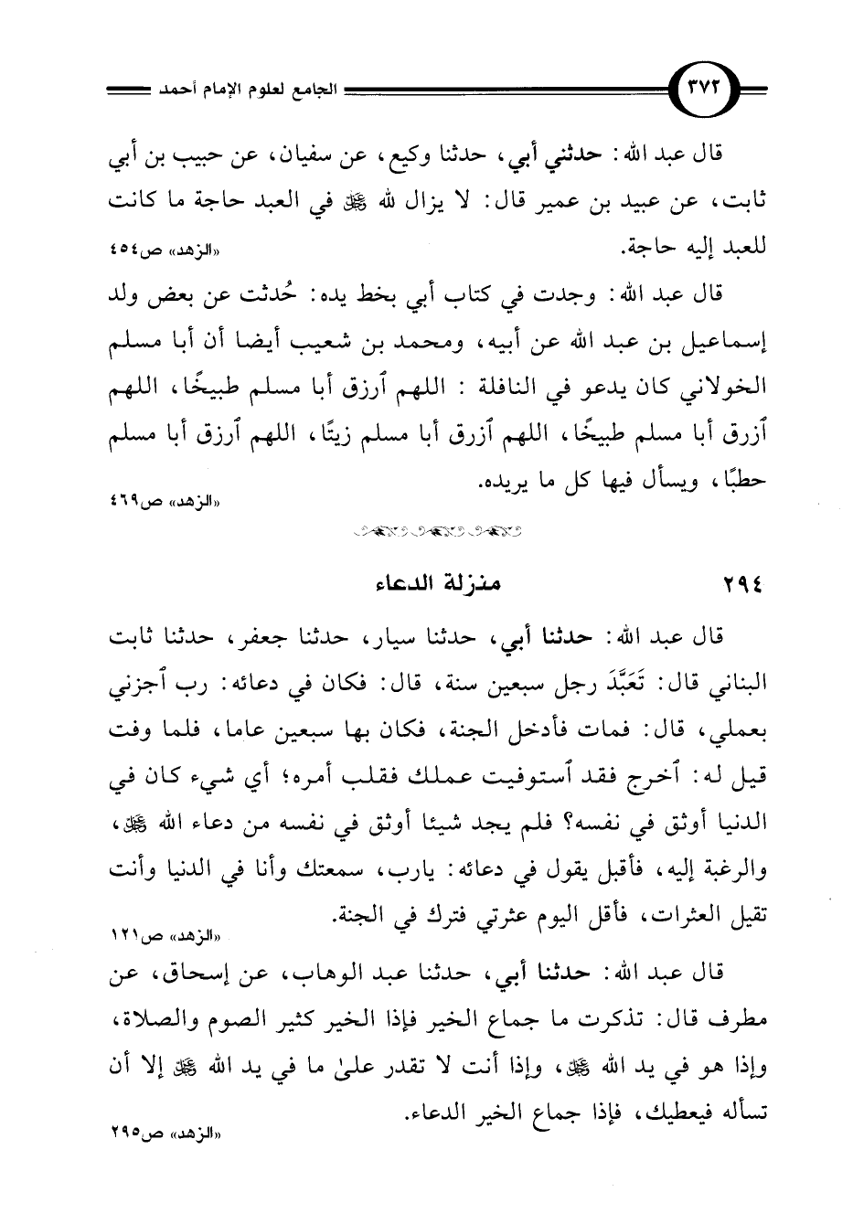 قال عبد اللَّه: وجدت في كتاب أبي بخط يده: حُدثت عن بعض ولد إسماعيل بن عبد اللَّه عن أبيه، ومحمد بن شعيب أيضًا أن أبا مسلم الخولاني كان يدعو في النافلة: اللهم ارزق أبا مسلم طبيخًا، اللهم ازرق أبا مسلم طبيخًا، اللهم ازرق أبا مسلم زيتًا، اللهم ارزق أبا مسلم حطبًا، ويسأل فيها كل ما يريده.