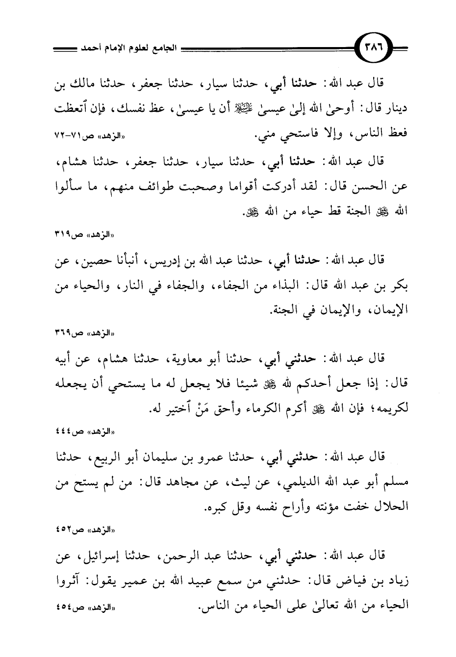 قال عبد اللَّه: حدثني أبي، حدثنا عمرو بن سليمان أبو الربيع، حدثنا مسلم أبو عبد اللَّه الديلمي، عن ليث، عن مجاهد قال: من لم يستح من الحلال خفت مؤنته وأراح نفسه وقل كبره.