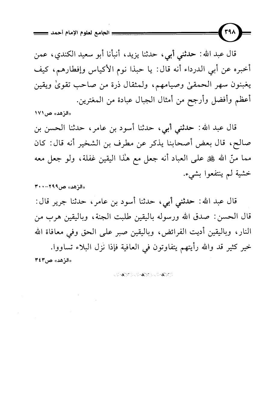 قال عبد اللَّه: حدثني أبي، حدثنا أسود بن عامر، حدثنا جرير قال: قال الحسن: صدق اللَّه ورسوله باليقين طلبت الجنة، وباليقين هرب من النار، وباليقين أديت الفرائض، وباليقين صبر على الحق وفي معافاة اللَّه خير كثير قد واللَّه رأيتهم يتفاوتون في العافية فإذا نزل البلاء تساووا.