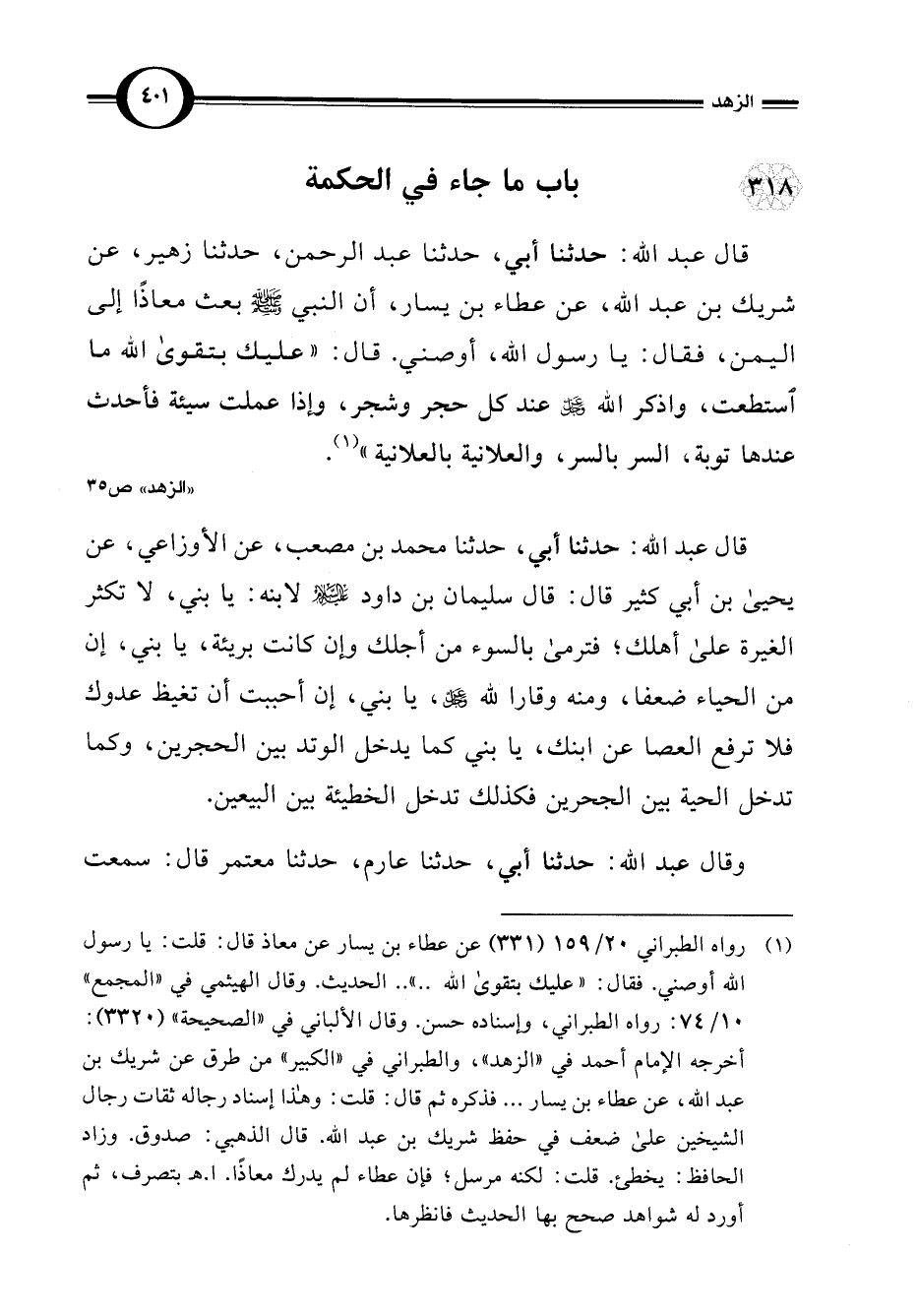 قال عبد اللَّه: حدثنا أبي، حدثنا عبد الرحمن، حدثنا زهير، عن شريك بن عبد اللَّه، عن عطاء بن يسار، أن النبي -صلى اللَّه عليه وسلم- بعث معاذًا إلى اليمن، فقال: يا رسول اللَّه، أوصني. قال: "عليك بتقوى اللَّه ما استطعت، واذكر اللَّه عز وجل عند كل حجر وشجر، وإذا عملت سيئة فأحدث عندها توبة، السر بالسر، والعلانية بالعلانية" (¬1).