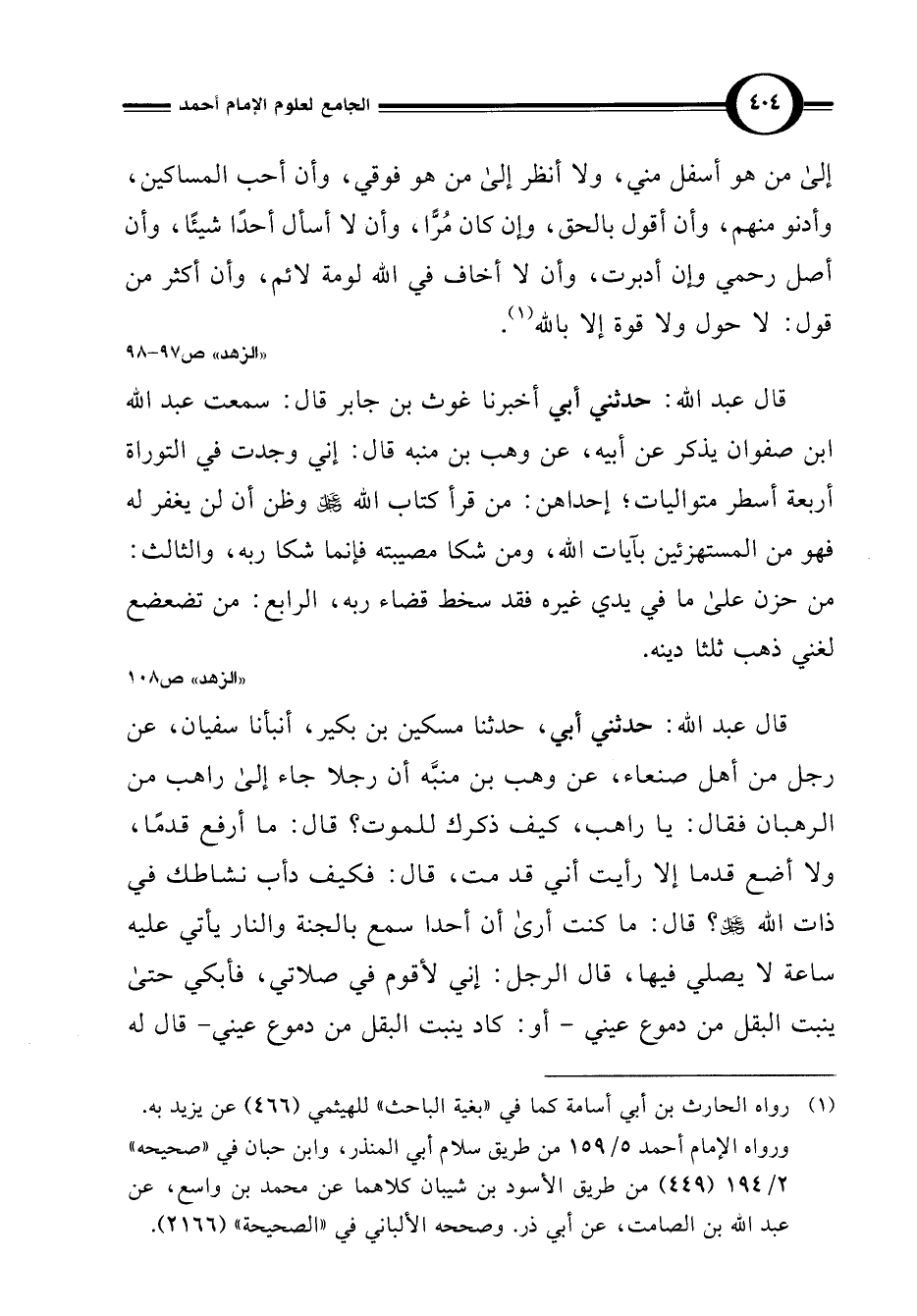 قال عبد اللَّه: حدثني أبي أخبرنا غوث بن جابر قال: سمعت عبد اللَّه ابن صفوان يذكر عن أبيه، عن وهب بن منبه قال: إني وجدت في التوراة أربعة أسطر متواليات؛ إحداهن: من قرأ كتاب اللَّه عز وجل وظن أن لن يغفر له فهو من المستهزئين بآيات اللَّه، ومن شكا مصيبته فإنما شكا ربه، والثالث: من حزن على ما في يدي غيره فقد سخط قضاء ربه، الرابع: من تضعضع لغني ذهب ثلثا دينه.