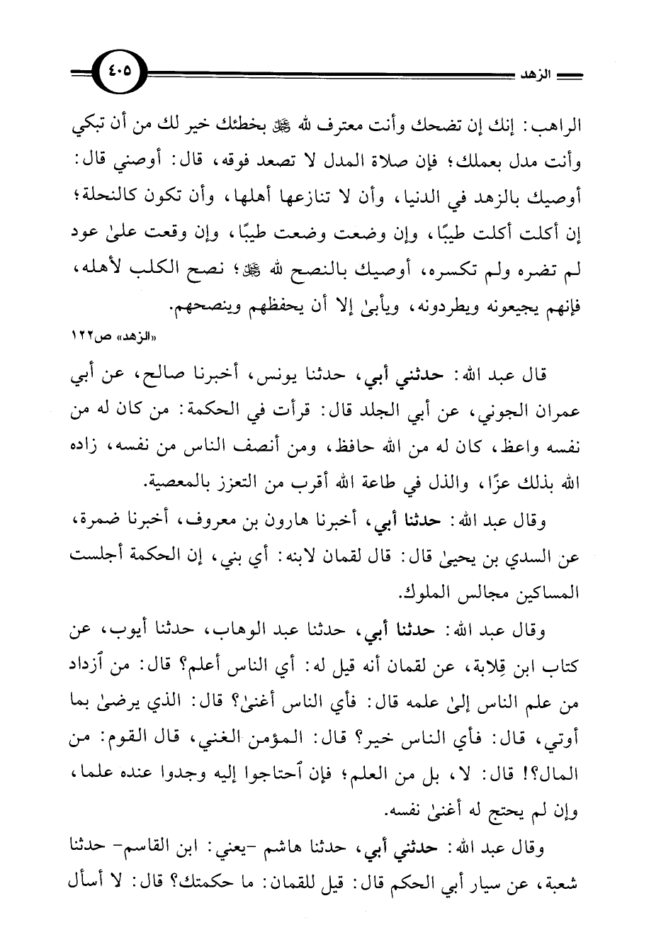 وقال عبد اللَّه: حدثنا أبي، أخبرنا هارون بن معروف، أخبرنا ضمرة، عن السدي بن يحيى قال: قال لقمان لابنه: أي بني، إن الحكمة أجلست المساكين مجالس الملوك.