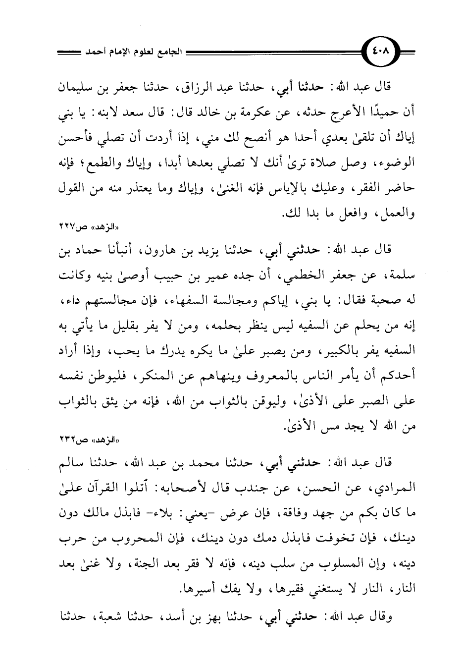 قال عبد اللَّه: حدثنا أبي، حدثنا عبد الرزاق، حدثنا جعفر بن سليمان أن حميدًا الأعرج حدثه، عن عكرمة بن خالد قال: قال سعد لابنه: يا بني إياك أن تلقى بعدي أحدا هو أنصح لك مني، إذا أردت أن تصلي فأحسن الوضوء، وصل صلاة ترى أنك لا تصلي بعدها أبدا، وإياك والطمع؛ فإنه حاضر الفقر، وعليك بالإياس فإنه الغنى، وإياك وما يعتذر منه من القول والعمل، وافعل ما بدا لك.