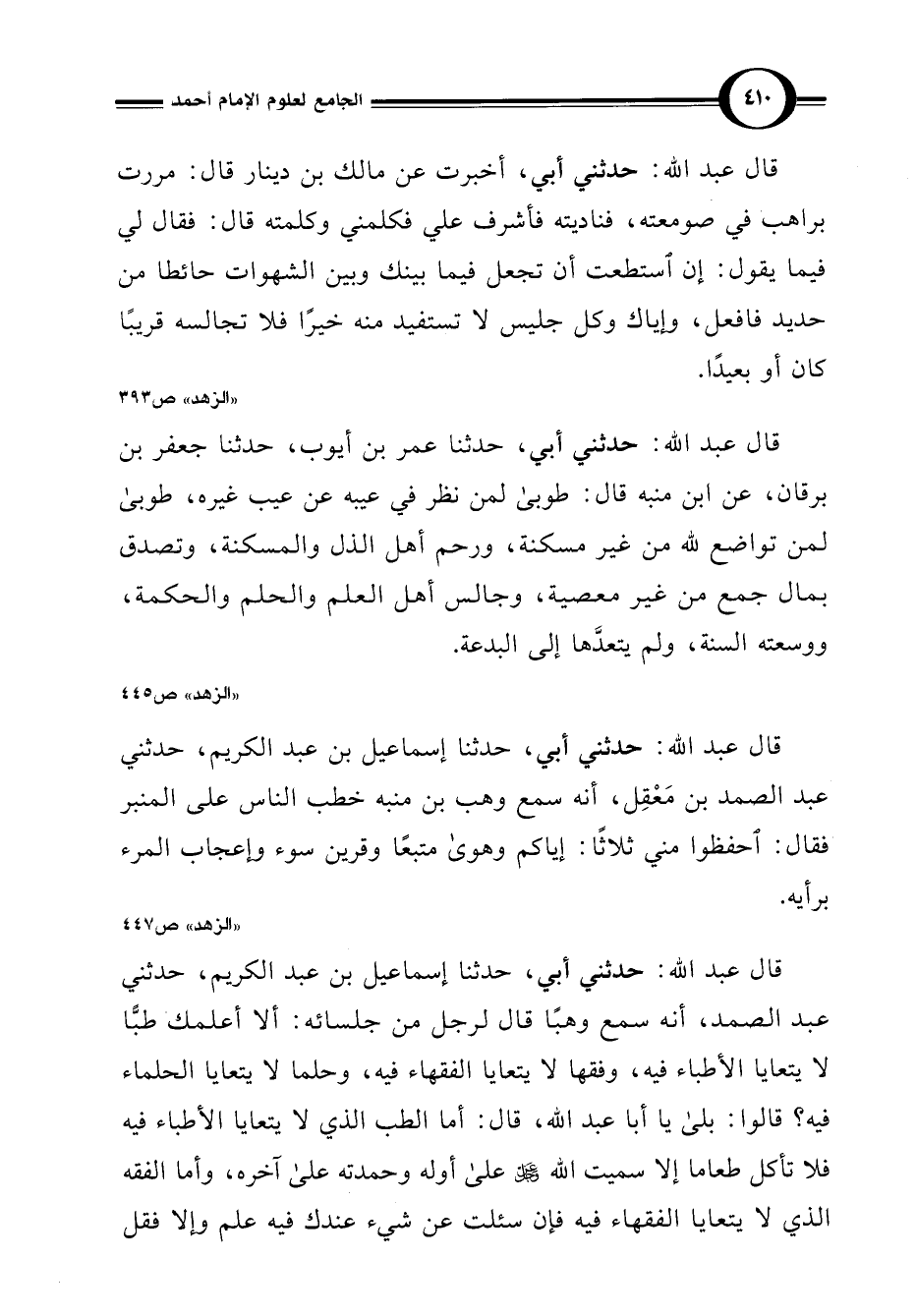 قال عبد اللَّه: حدثني أبي، أخبرت عن مالك بن دينار قال: مررت براهب في صومعته، فناديته فأشرف عليّ فكلمني وكلمته قال: فقال لي فيما يقول: إن استطعت أن تجعل فيما بينك وبين الشهوات حائطا من حديد فافعل، وإياك وكل جليس لا تستفيد منه خيرًا فلا تجالسه قريبًا كان أو بعيدًا.