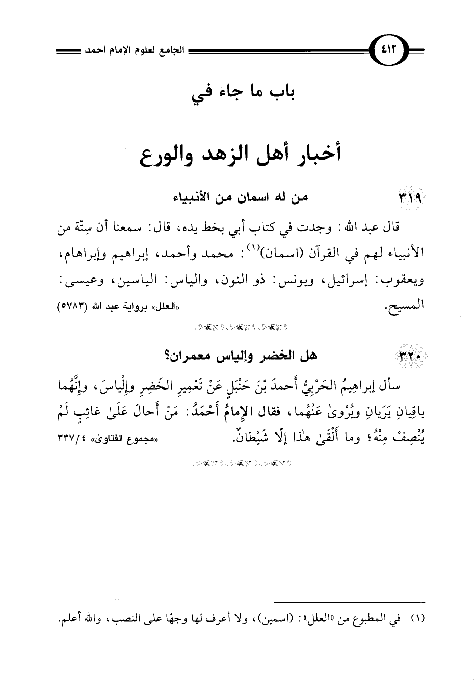 قال عبد اللَّه: وجدت في كتاب أبي بخط يده، قال: سمعنا أن سِتّة من الأنبياء لهم في القرآن (اسمان) (¬1): محمد وأحمد، إبراهيم وإبراهام، ويعقوب: إسرائيل، ويونس: ذو النون، والياس: الياسين، وعيسى: المسيح.