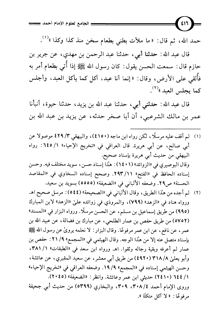قال عبد اللَّه: حدثنا أبي، حدثنا عبد الرحمن بن مهدي، عن جرير بن حازم قال: سمعت الحسن يقول: كان رسول اللَّه -صلى اللَّه عليه وسلم- إذا أُتي بطعام أمر به فأُلقي على الأرض، وقال: "إنما أنا عبد، آكل كما يأكل العبد، وأجلس كما يجلس العبد" (¬2).