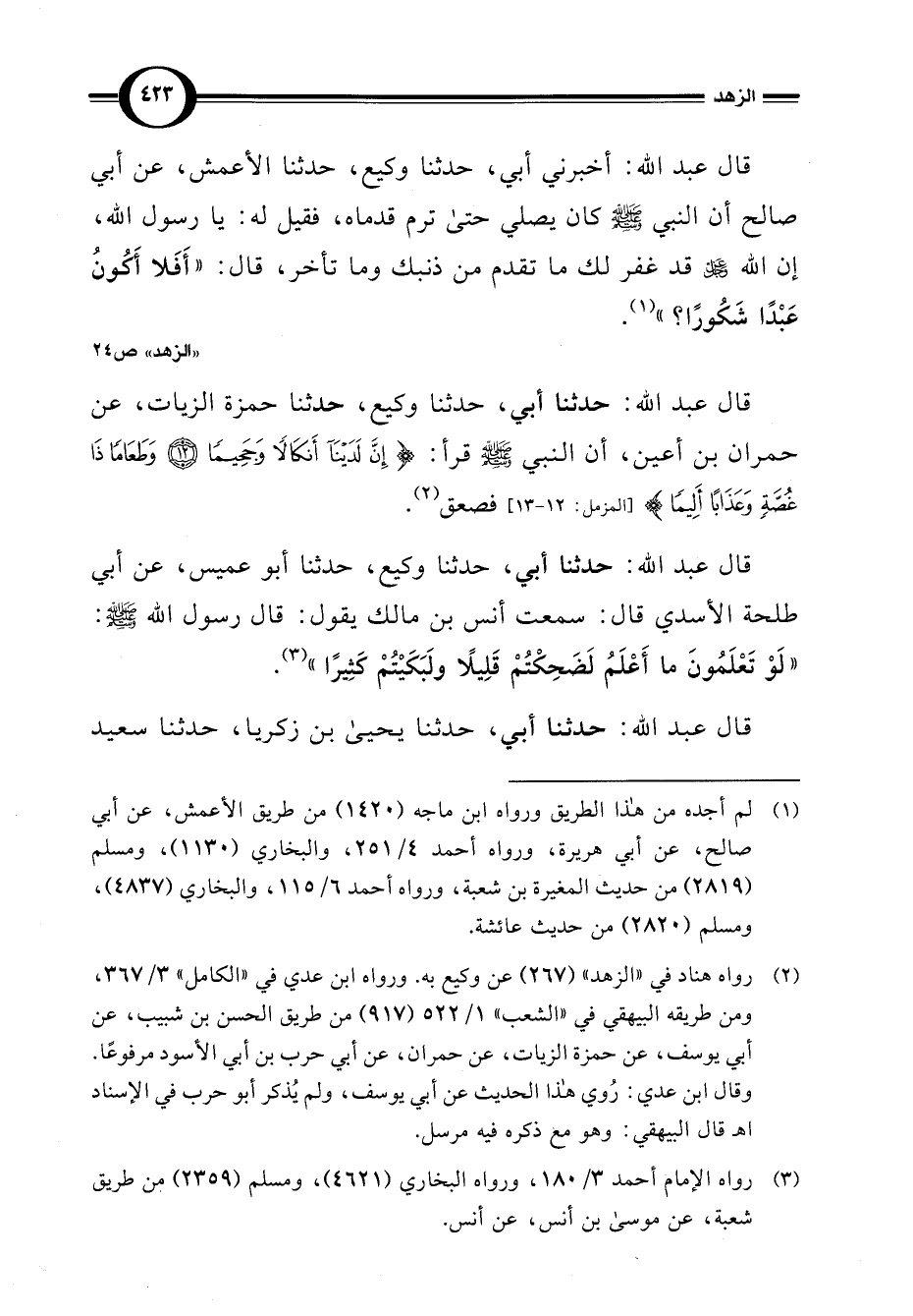 قال عبد اللَّه: أخبرني أبي، حدثنا وكيع، حدثنا الأعمش، عن أبي صالح أن النبي -صلى اللَّه عليه وسلم- كان يصلي حتى ترم قدماه، فقيل له: يا رسول اللَّه، إن اللَّه عز وجل قد غفر لك ما تقدم من ذنبك وما تأخر، قال: "أَفَلا أَكُونُ عَبْدًا شَكُورًا؟ " (¬1).