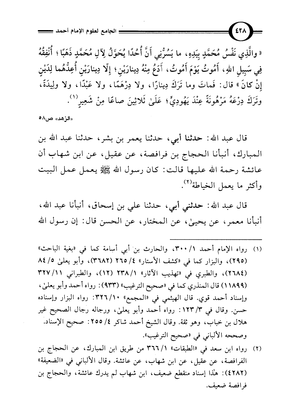 قال عبد اللَّه: حدثنا أبي، حدثنا يعمر بن بشر، حدثنا عبد اللَّه بن المبارك، أنبأنا الحجاج بن فرافصة، عن عقيل، عن ابن شهاب أن عائشة رحمة اللَّه عليها قالت: كان رسول اللَّه -صلى اللَّه عليه وسلم- يعمل عمل البيت وأكثر ما يعمل الخياطة (¬2).