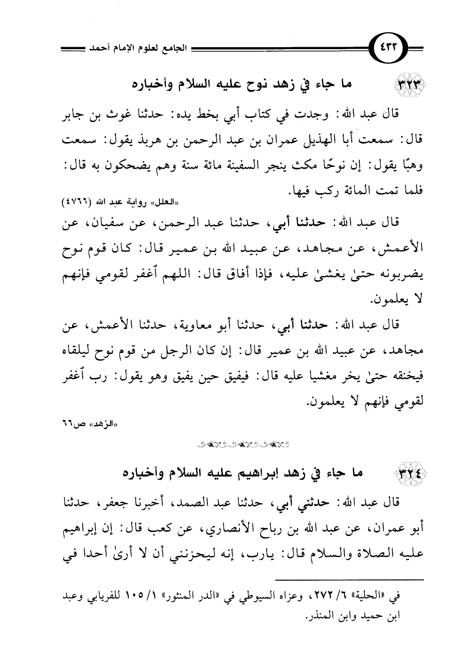 قال عبد اللَّه: وجدت في كتاب أبي بخط يده: حدثنا غوث بن جابر قال: سمعت أبا الهذيل عمران بن عبد الرحمن بن هربذ يقول: سمعت وهبًا يقول: إن نوحًا مكث ينجر السفينة مائة سنة وهم يضحكون به قال: فلما تمت المائة ركب فيها.