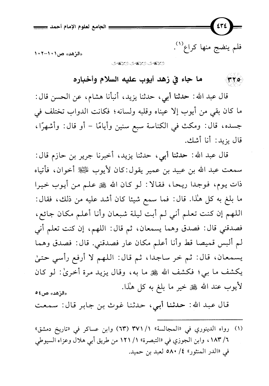 قال عبد اللَّه: حدثنا أبي، حدثنا يزيد، أخبرنا جرير بن حازم قال: سمعت عبد اللَّه بن عبيد بن عمير يقول: كان لأيوب عليه السلام أخوان، فأتياه ذات يوم، فوجدا ريحا، فقالا: لو كان اللَّه عز وجل علم من أيوب خيرا ما بلغ به كل هذا. قال: فما سمع شيئا كان أشد عليه من ذلك، فقال: اللهم إن كنت تعلم أني لم أبت ليلة شبعان وأنا أعلم مكان جائع، فصدقني قال: فصدق وهما يسمعان، ثم قال: اللهم، إن كنت تعلم أني لم ألبس قميصا قط وأنا أعلم مكان عار فصدقني. قال: فصدق وهما يسمعان، قال: ثم خر ساجدا، ثم قال: اللهم لا أرفع رأسي حتى يكشف ما بي؛ فكشف اللَّه عز وجل ما به، وقال يزيد مرة أخرى: لو كان لأيوب عند اللَّه عز وجل خير ما بلغ به كل هذا.