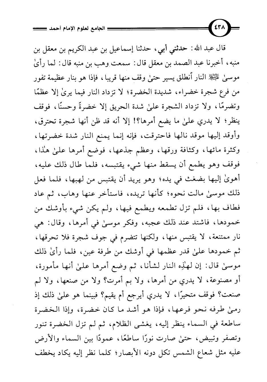 قال عبد اللَّه: حدثني أبي، حدثنا إسماعيل بن عبد الكريم بن معقل بن منبه، أخبرنا عبد الصمد بن معقل قال: سمعت وهب بن منبه قال: لما رأى موسى عليه السلام النار انطلق يسير حتى وقف منها قريبا، فإذا هو بنار عظيمة تفور من فرع شجرة خضراء، شديدة الخضرة؛ لا تزداد النار فيما يرى إلا عظمًا وتضرمًا، ولا تزداد الشجرة على شدة الحريق إلا خضرةً وحسنًا، فوقف ينظر؛ لا يدري على ما يضع أمرها؟ ! إلا أنه قد ظن أنها شجرة تحترق، وأوقد إليها موقد نالها فاحترقت، فإنه إنما يمنع النار شدة خضرتها، وكثرة مائها، وكثافة ورقها، وعظم جذعها، فوضع أمرها على هذا، فوقف وهو يطمع أن يسقط منها شيء يقتبسه، فلما طال ذلك عليه، أهوى إليها بضغث في يده؛ وهو يريد أن يقتبس من لهبها، فلما فعل ذلك موسى مالت نحوه؛ كأنها تريده، فاستأخر عنها وهاب، ثم عاد فطاف بها، فلم تزل تطمعه ويطمع فيها، ولم يكن شيء بأوشك من خمودها، فاشتد عند ذلك عجبه، وفكر موسى في أمرها، وقال: هي نار ممتنعة، لا يقتبس منها، ولكنها تتضرم في جوف شجرة فلا تحرقها، ثم خمودها على قدر عظمها في أوشك من طرفة عين، فلما رأى ذلك موسى قال: إن لهذِه النار لشأنا، ثم وضع أمرها على أنها مأمورة، أو مصنوعة، لا يدري من أمرها، ولا بم أمرت؟ ولا من صنعها، ولا لم صنعت؟ فوقف متحيرًا، لا يدري أيرجع أم يقيم؟ فبينما هو على ذلك إذ رمى طرفه نحو فرعها، فإذا هو أشد ما كان خضرة، وإذا الخضرة ساطعة في السماء ينظر إليه، يغشى الظلام، ثم لم تزل الخضرة تنور وتصفر وتبيض، حتى صارت نورًا ساطعًا، عمودًا بين السماء والأرض عليه مثل شعاع الشمس تكل دونه الأبصار؛ كلما نظر إليه يكاد يخطف