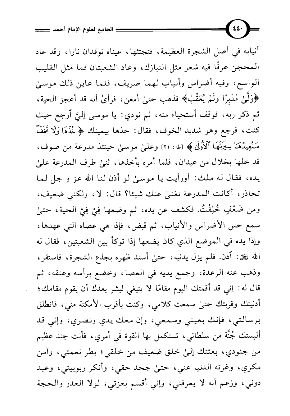 أنيابه في أصل الشجرة العظيمة، فتجتثها، عيناه توقدان نارا، وقد عاد المحجن عرفًا فيه شعر مثل النيازك، وعاد الشعبتان فما مثل القليب الواسع، وفيه أضراس وأنياب لهما صريف، فلما عاين ذلك موسى {وَلَّى مُدْبِرًا وَلَمْ يُعَقِّبْ} فذهب حتى أمعن، فرأى أنه قد أعجز الحية، ثم ذكر ربه، فوقف استحياء منه، ثم نودي: يا موسى إليَّ ارجع حيث كنت، فرجع وهو شديد الخوف، فقال: خذها بيمينك {خُذْهَا وَلَا تَخَفْ سَنُعِيدُهَا سِيرَتَهَا الْأُولَى} [طه: 21] وعلى موسى حينئذ مدرعة من صوف، قد خلها بخلال من عيدان، فلما أمره بأخذها، ثنى طرف المدرعة على يده، فقال له ملك: أورأيت يا موسى لو أذن لنا اللَّه عز وجل لما تحاذر، أكانت المدرعة تغنى عنك شيئا؟ قال: لا، ولكني ضعيف، ومن ضَعْفٍ خُلِقْتُ. فكشف عن يده، ثم وضعها فِي فِيّ الحية، حتى سمع حس الأضراس والأنياب، ثم قبض، فإذا هي عصاه التي عهدها، وإذا يده في الموضع الذي كان يضعها إذا توكأ بين الشعبتين، فقال له اللَّه عز وجل: ادن. فلم يزل يدنيه، حتى أسند ظهره بجذع الشجرة، فاستقر، وذهب عنه الرعدة، وجمع يديه في العصا، وخضع برأسه وعنقه، ثم قال له: إني قد أقمتك اليوم مقامًا لا ينبغي لبشر بعدك أن يقوم مقامك؛ أدنيتك وقربتك حتى سمعت كلامي، وكنت بأقرب الأمكنة مني، فانطلق برسالتي، فإنك بعيني وسمعي، وإن معك يدي ونصري، وإني قد ألبستك جُنَّة من سلطاني، تستكمل بها القوة في أمري، فأنت جند عظيم من جنودي، بعثتك إلى خلق ضعيف من خلقي، بطر نعمتي، وأمن مكري، وغرته الدنيا عني، حتى جحد حقي، وأنكر ربوبيتي، وعبد دوني، وزعم أنه لا يعرفني، وإني أقسم بعزتي، لولا العذر والحجة