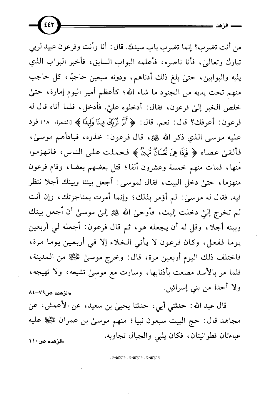 قال عبد اللَّه: حدثني أبي، حدثنا يحيى بن سعيد، عن الأعمش، عن مجاهد قال: حج البيت سبعون نبيا؛ منهم موسى بن عمران عليه السلام عليه عباءتان قطوانيتان، فكان يلبي والجبال تجاوبه.