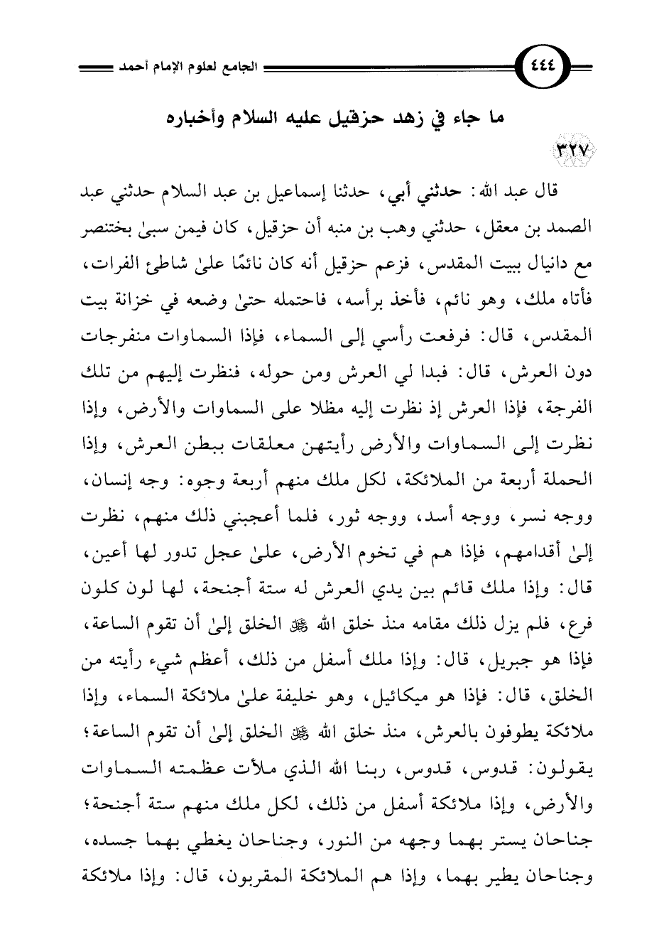قال عبد اللَّه: حدثني أبي، حدثنا إسماعيل بن عبد السلام حدثني عبد الصمد بن معقل، حدثني وهب بن منبه أن حزقيل، كان فيمن سبى بختنصر مع دانيال ببيت المقدس، فزعم حزقيل أنه كان نائمًا على شاطئ الفرات، فأتاه ملك، وهو نائم، فأخذ برأسه، فاحتمله حتى وضعه في خزانة بيت المقدس، قال: فرفعت رأسي إلى السماء، فإذا السماوات منفرجات دون العرش، قال: فبدا لي العرش ومن حوله، فنظرت إليهم من تلك الفرجة، فإذا العرش إذ نظرت إليه مظلا على السماوات والأرض، وإذا نظرت إلى السماوات والأرض رأيتهن معلقات ببطن العرش، وإذا الحملة أربعة من الملائكة، لكل ملك منهم أربعة وجوه: وجه إنسان، ووجه نسر، ووجه أسد، ووجه ثور، فلما أعجبني ذلك منهم، نظرت إلى أقدامهم، فإذا هم في تخوم الأرض، على عجل تدور لها أعين، قال: وإذا ملك قائم بين يدي العرش له ستة أجنحة، لها لون كلون فرع، فلم يزل ذلك مقامه منذ خلق اللَّه عز وجل الخلق إلى أن تقوم الساعة، فإذا هو جبريل، قال: وإذا ملك أسفل من ذلك، أعظم شيء رأيته من الخلق، قال: فإذا هو ميكائيل، وهو خليفة على ملائكة السماء، وإذا ملائكة يطوفون بالعرش، منذ خلق اللَّه عز وجل الخلق إلى أن تقوم الساعة؛ يقولون: قدوس، قدوس، ربنا اللَّه الذي ملأت عظمته السماوات والأرض، وإذا ملائكة أسفل من ذلك، لكل ملك منهم ستة أجنحة؛ جناحان يستر بهما وجهه من النور، وجناحان يغطي بهما جسده، وجناحان يطير بهما، وإذا هم الملائكة المقربون، قال: وإذا ملائكة
