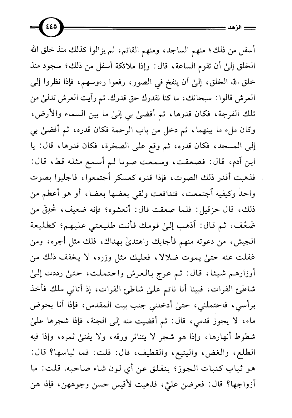 أسفل من ذلك؛ منهم الساجد، ومنهم القائم، لم يزالوا كذلك منذ خلق اللَّه الخلق إلى أن تقوم الساعة، قال: وإذا ملائكة أسفل من ذلك؛ سجود منذ خلق اللَّه الخلق، إلى أن ينفخ في الصور، رفعوا رءوسهم، فإذا نظروا إلى العرش قالوا: سبحانك، ما كنا نقدرك حق قدرك. ثم رأيت العرش تدلى من تلك الفرجة، فكان قدرها، ثم أفضى بي إلى ما بين السماء والأرض، وكان ملء ما بينهما، ثم دخل من باب الرحمة فكان قدره، ثم أفضى بي إلى المسجد، فكان قدره، ثم وقع على الصخرة، فكان قدرها، قال: يا ابن آدم، قال: فصعقت، وسمعت صوتا لم أسمع مثله قط، قال: فذهبت أقدر ذلك الصوت، فإذا قدره كعسكر اجتمعوا، فاجلبوا بصوت واحد وكيفية اجتمعت، فتدافعت ولقي بعضها بعضا، أو هو أعظم من ذلك، قال حزقيل: فلما صعقت قال: أنعشوه؛ فإنه ضعيف، خُلِقَ من ضَعْف، ثم قال: أذهب إلى قومك فأنت طليعتي عليهم؛ كطليعة الجيش، من دعوته منهم فأجابك واهتدى بهداك، فلك مثل أجره، ومن غفلت عنه حتى يموت ضلالا، فعليك مثل وزره، لا يخفف ذلك من أوزارهم شيئا، قال: ثم عرج بالعرش واحتملت، حتى رددت إلى شاطئ الفرات، فبينا أنا نائم على شاطئ الفرات، إذ أتاني ملك فأخذ برأسي، فاحتملني، حتى أدخلني جنب بيت المقدس، فإذا أنا بحوض ماء، لا يجوز قدمي، قال: ثم أفضيت منه إلى الجنة، فإذا شجرها على شطوط أنهارها، وإذا هو شجر لا يتناثر ورقه، ولا يفنى ثمره، وإذا فيه الطلع، والغض، والينيع، والقطيف، قال: قلت: فما لباسها؟ قال: هو ثياب كنبات الجوز؛ ينفلق عن أي لون شاء صاحبه. قلت: ما أزواجها؟ قال: فعرضن عليَّ، فذهبت لأقيس حسن وجوههن، فإذا هن