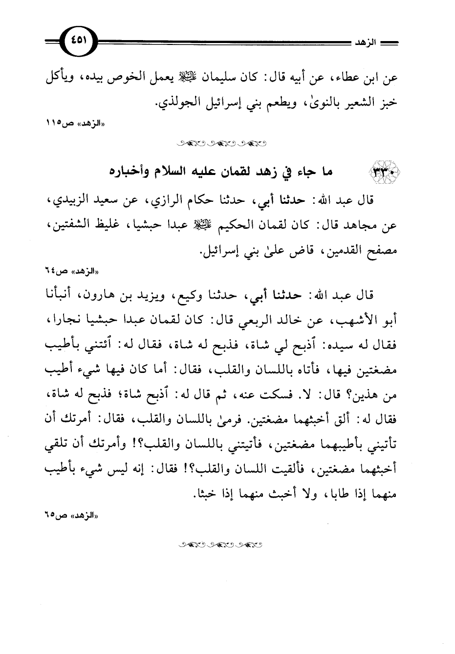 قال عبد اللَّه: حدثنا أبي، حدثنا وكيع، ويزيد بن هارون، أنبأنا أبو الأشهب، عن خالد الربعي قال: كان لقمان عبدا حبشيا نجارا، فقال له سيده: اذبح لي شاة، فذبح له شاة، فقال له: ائتني بأطيب مضغتين فيها، فأتاه باللسان والقلب، فقال: أما كان فيها شيء أطيب من هذين؟ قال: لا. فسكت عنه، ثم قال له: اذبح شاة؛ فذبح له شاة، فقال له: ألق أخبثهما مضغتين. فرمى باللسان والقلب، فقال: أمرتك أن تأتيني بأطيبهما مضغتين، فأتيتني باللسان والقلب؟ ! وأمرتك أن تلقي أخبثهما مضغتين، فألقيت اللسان والقلب؟ ! فقال: إنه ليس شيء بأطيب منهما إذا طابا، ولا أخبث منهما إذا خبثا.