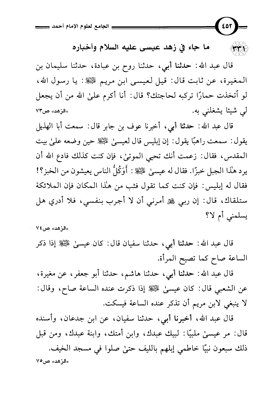 قال عبد اللَّه: حدثنا أبي، حدثنا سفيان قال: كان عيسى عليه السلام إذا ذكر الساعة صاح كما تصيح المرأة.