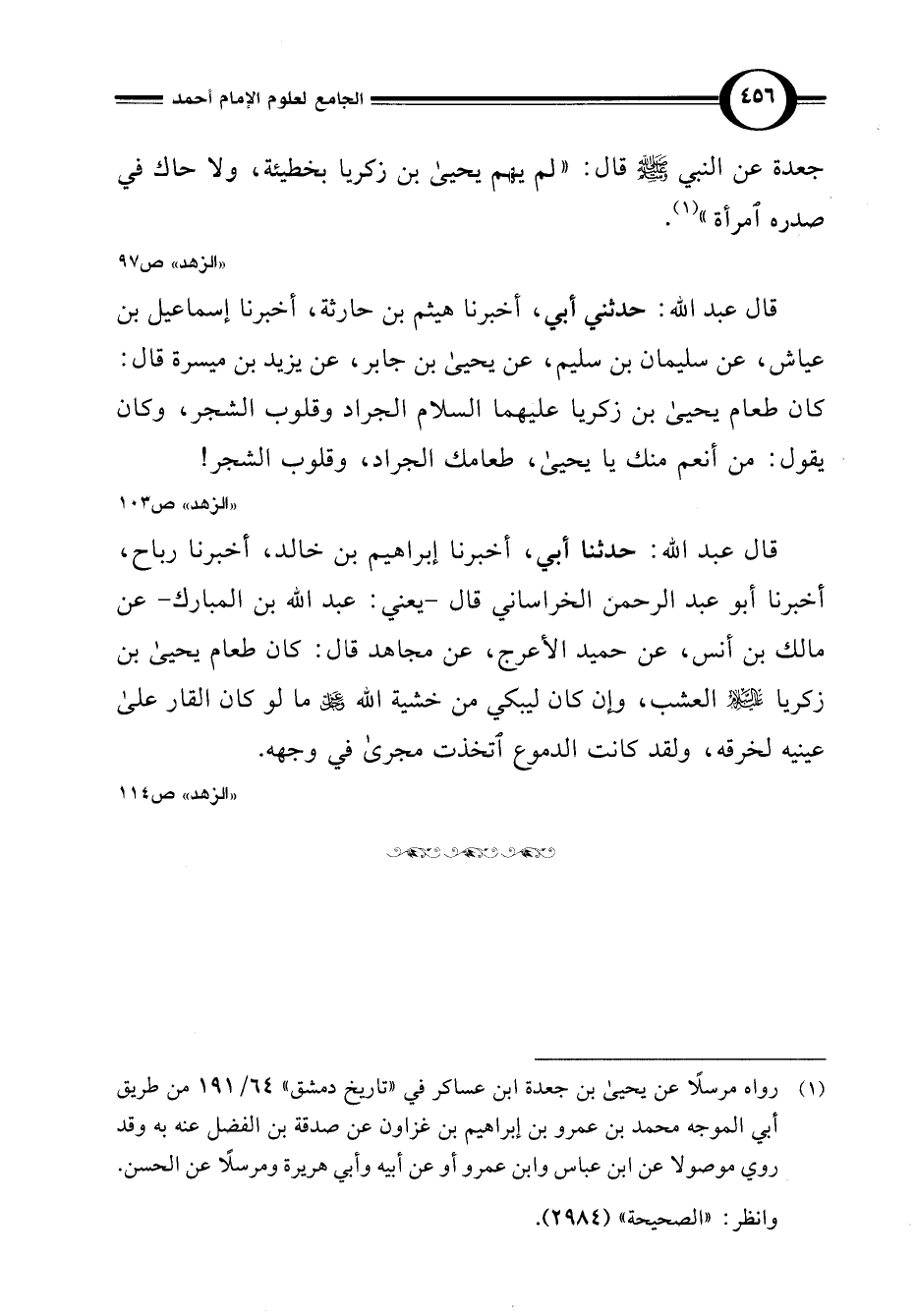 قال عبد اللَّه: حدثني أبي، أخبرنا هيثم بن حارثة، أخبرنا إسماعيل بن عياش، عن سليمان بن سليم، عن يحيى بن جابر، عن يزيد بن ميسرة قال: كان طعام يحيى بن زكريا عليهما السلام الجراد وقلوب الشجر، وكان يقول: من أنعم منك يا يحيى، طعامك الجراد، وقلوب الشجر!