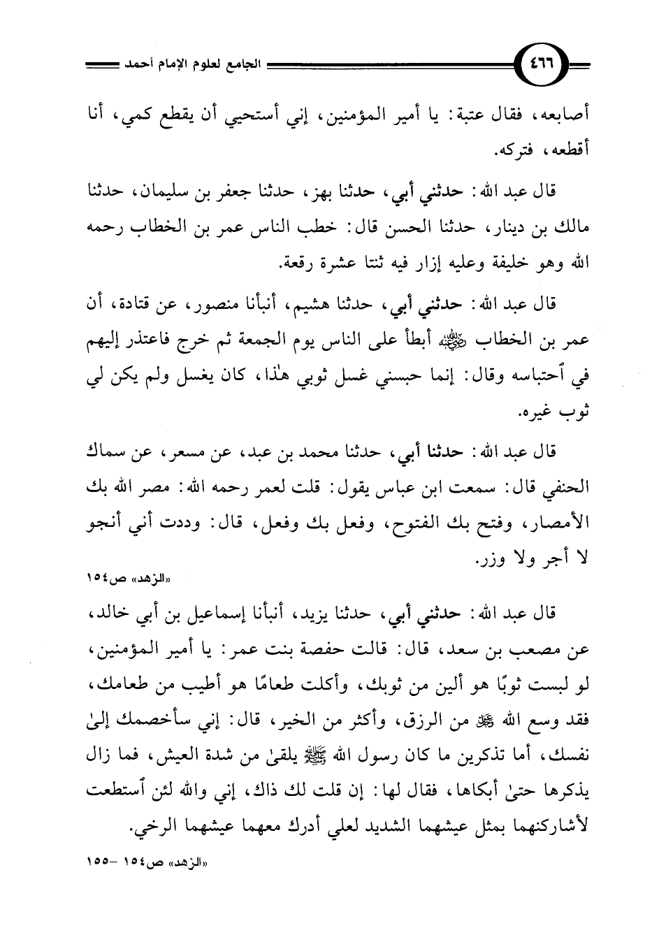 قال عبد اللَّه: حدثني أبي، حدثنا بهز، حدثنا جعفر بن سليمان، حدثنا مالك بن دينار، حدثنا الحسن قال: خطب الناس عمر بن الخطاب رحمه اللَّه وهو خليفة وعليه إزار فيه ثنتا عشرة رقعة.
