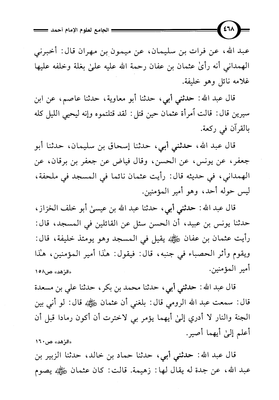 قال عبد اللَّه، حدثني أبي، حدثنا إسحاق بن سليمان، حدثنا أبو جعفر، عن يونس، عن الحسن، وقال فياض عن جعفر بن برقان، عن الهمداني، في حديثه قال: رأيت عثمان نائما في المسجد في ملحفة، ليس حوله أحد، وهو أمير المؤمنين.