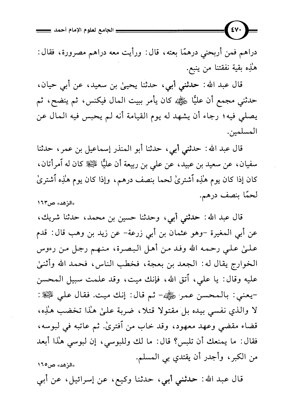 قال عبد اللَّه: حدثني أبي، وحدثنا حسين بن محمد، حدثنا شريك، عن أبي المغيرة -وهو عثمان بن أبي زرعة- عن زيد بن وهب قال: قدم على علي رحمه اللَّه وفد من أهل البصرة، منهم رجل من رءوس الخوارج يقال له: الجعد بن بعجة، فخطب الناس، فحمد اللَّه وأثنى عليه وقال: يا علي، اتق اللَّه، فإنك ميت، وقد علمت سبيل المحسن -يعني: بالمحسن عمر -رضي اللَّه عنه- ثم قال: إنك ميت. فقال علي عليه السلام: لا والذي نفسي بيده بل مقتولا قتلا، ضربة على هذا تخضب هذِه، قضاء مقضي وعهد معهود، وقد خاب من افترى. ثم عاتبه في لبوسه، فقال: ما يمنعك أن تلبس؟ قال: ما لك وللبوسي، إن لبوسي هذا أبعد من الكبر، وأجدر أن يقتدي بي المسلم.