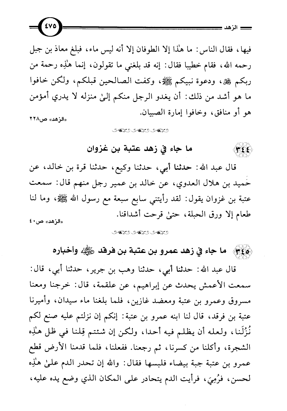 قال عبد اللَّه: حدثنا أبي، حدثنا وكيع، حدثنا قرة بن خالد، عن حميد بن هلال العدوي، عن خالد بن عمير رجل منهم قال: سمعت عتبة بن غزوان يقول: لقد رأيتني سابع سبعة مع رسول اللَّه -صلى اللَّه عليه وسلم-، وما لنا طعام إلَّا ورق الحبلة، حتَّى قرحت أشداقنا.