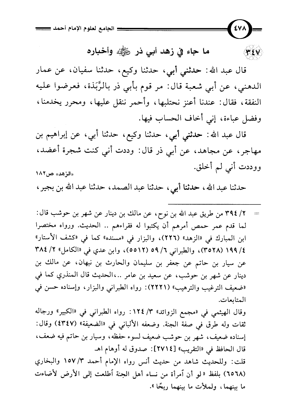 قال عبد اللَّه: حدثني أبي، حدثنا وكيع، حدثنا أبي، عن إبراهيم بن مهاجر، عن مجاهد، عن أبي ذر قال: وددت أني كنت شجرة أعضد، ووددت أني لم أخلق.