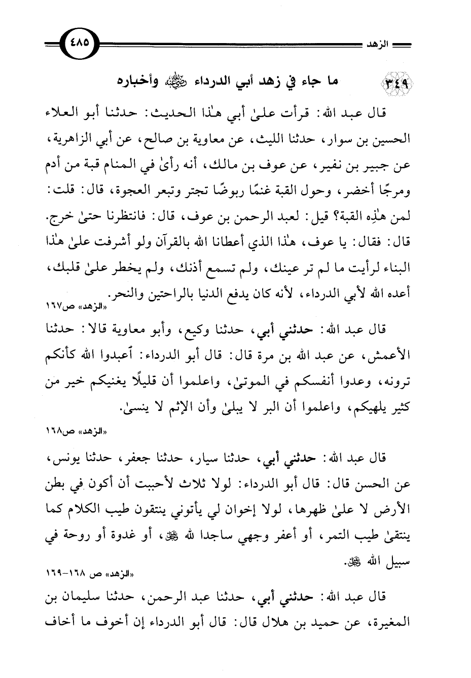 قال عبد اللَّه: قرأت على أبي هذا الحديث: حدثنا أبو العلاء الحسين بن سوار، حدثنا الليث، عن معاوية بن صالح، عن أبي الزاهرية، عن جبير بن نفير، عن عوف بن مالك، أنه رأى في المنام قبة من أدم ومرجًا أخضر، وحول القبة غنمًّا ربوضًا تجتر وتبعر العجوة، قال: قلت: لمن هذِه القبة؟ قيل: لعبد الرحمن بن عوف، قال: فانتظرنا حتَّى خرج. قال: فقال: يا عوف، هذا الذي أعطانا اللَّه بالقرآن ولو أشرفت على هذا البناء لرأيت ما لم تر عينك، ولم تسمع أذنك، ولم يخطر على قلبك، أعده اللَّه لأبي الدرداء، لأنه كان يدفع الدنيا بالراحتين والنحر.
