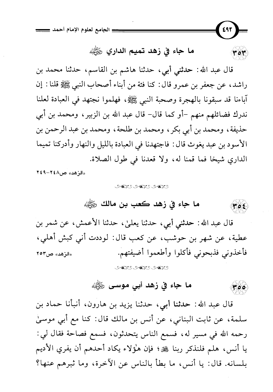 قال عبد اللَّه: حدثني أبي، حدثنا هاشم بن القاسم، حدثنا محمد بن راشد، عن جعفر بن عمرو قال: كنا فئة من أبناء أصحاب النبي -صلى اللَّه عليه وسلم- قلنا: إن آباءنا قد سبقونا بالهجرة وصحبة النبي -صلى اللَّه عليه وسلم-، فهلموا نجتهد في العبادة لعلنا ندرك فضائلهم منهم -أو كما قال- قال عبد اللَّه بن الزبير، ومحمد بن أبي حذيفة، ومحمد بن أبي بكر، ومحمد بن طلحة، ومحمد بن عبد الرحمن بن الأسود بن عبد يغوث قال: فاجتهدنا في العبادة بالليل والنهار وأدركنا تميما الداري شيخا فما قمنا له، ولا قعدنا في طول الصلاة.