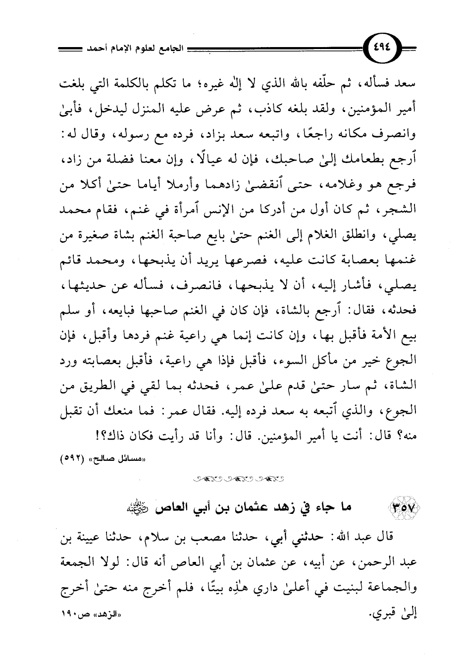 سعد فسأله، ثم حلّفه باللَّه الذي لا إله غيره؟ ما تكلم بالكلمة التي بلغت أمير المؤمنين، ولقد بلغه كاذب، ثم عرض عليه المنزل ليدخل، فأبى وانصرف مكانه راجعًا، واتبعه سعد بزاد، فرده مع رسوله، وقال له: ارجع بطعامك إلى صاحبك، فإن له عيالًا، وإن معنا فضلة من زاد، فرجع هو وغلامه، حتَّى انقضى زادهما وأرملا أياما حتَّى أكلا من الشجر، ثم كان أول من أدركا من الإنس امرأة في غنم، فقام محمد يصلي، وانطلق الغلام إلى الغنم حتَّى بايع صاحبة الغنم بشاة صغيرة من غنمها بعصابة كانت عليه، فصرعها يريد أن يذبحها، ومحمد قائم يصلي، فأشار إليه، أن لا يذبحها، فانصرف، فسأله عن حديثها، فحدثه، فقال: ارجع بالشاة، فإن كان في الغنم صاحبها فبايعه، أو سلم بيع الأمة فأقبل بها، وإن كانت إنما هي راعية غنم فردها وأقبل، فإن الجوع خير من مأكل السوء، فأقبل فإذا هي راعية، فأقبل بعصابته ورد الشاة، ثم سار حتَّى قدم على عمر، فحدثه بما لقي في الطريق من الجوع، والذي اتبعه به سعد فرده إليه. فقال عمر: فما منعك أن تقبل منه؟ قال: أنت يا أمير المؤمنين. قال: وأنا قد رأيت فكان ذاك؟ !