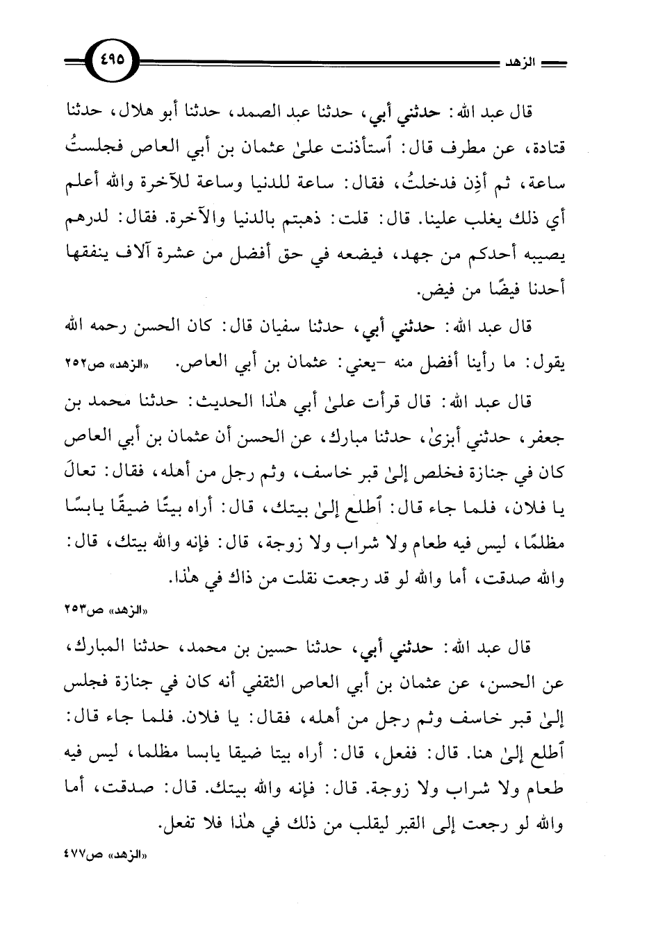 قال عبد اللَّه: قال قرأت على أبي هذا الحديث: حدثنا محمد بن جعفر، حدثني أبزى، حدثنا مبارك، عن الحسن أن عثمان بن أبي العاص كان في جنازة فخلص إلى قبر خاسف، وثم رجل من أهله، فقال: تعالَ يا فلان، فلما جاء قال: اطلع إلى بيتك، قال: أراه بيتًا ضيقًا يابسًا مظلمًا، ليس فيه طعام ولا شراب ولا زوجة، قال: فإنه واللَّه بيتك، قال: واللَّه صدقت، أما واللَّه لو قد رجعت نقلت من ذاك في هذا.