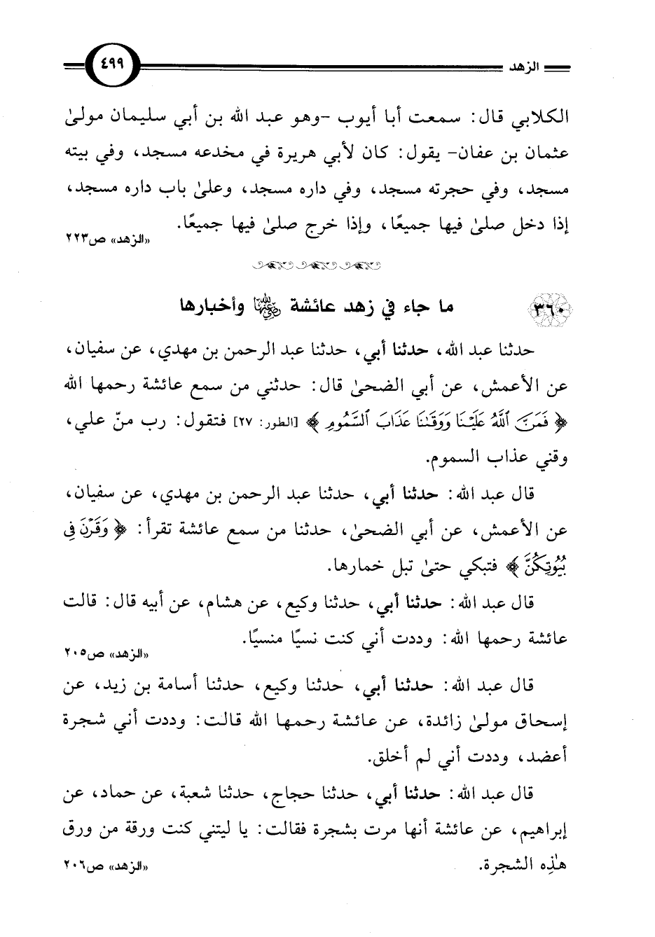 قال عبد اللَّه: حدثنا أبي، حدثنا وكيع، حدثنا أسامة بن زيد، عن إسحاق مولى زائدة، عن عائشة رحمها اللَّه قالت: وددت أني شجرة أعضد، وددت أني لم أخلق.