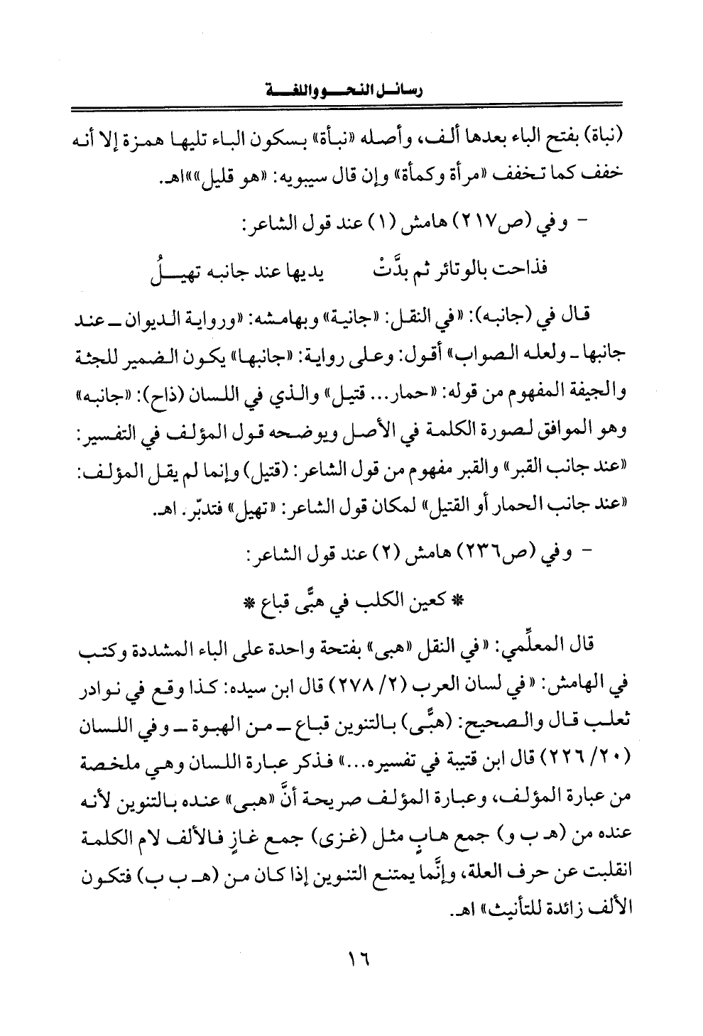 قال المعلِّمي: "في النقل "هبى" بفتحة واحدة على الباء المشددة وكتب في الهامش: "في لسان العرب (٢/ ٢٧٨) قال ابن سيده: كذا وقع في نوادر ثعلب قال والصحيح: (هبًّى) بالتنوين قباع ــ من الهبوة ــ وفي اللسان (٢٠/ ٢٢٦) قال ابن قتيبة في تفسيره ... " فذكر عبارة اللسان وهي ملخصة من عبارة المؤلف، وعبارة المؤلف صريحة أنَّ "هبى" عنده بالتنوين لأنه عنده من (هـ ب و) جمع هابٍ مثل (غزى) جمع غازٍ فالألف لام الكلمة انقلبت عن حرف العلة، وإنَّما يمتنع التنوين إذا كان من (هـ ب ب) فتكون الألف زائدة للتأنيث" اهـ.