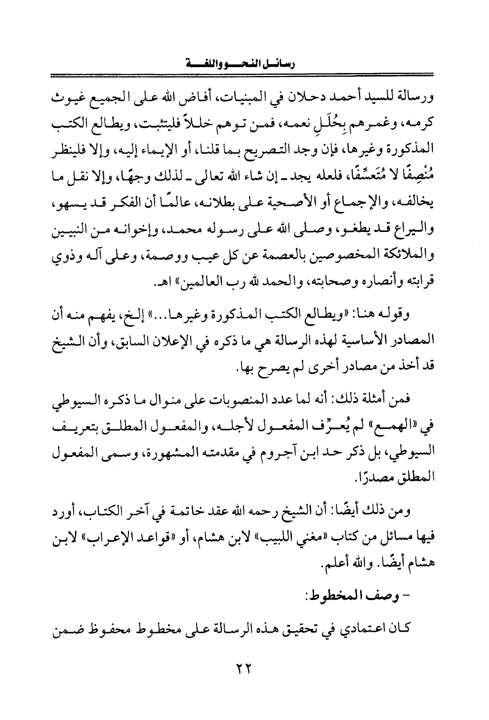 ورسالة للسيد أحمد دحلان في المبنيات، أفاض الله على الجميع غيوث كرمه، وغمرهم بِحُلَلِ نعمه، فمن توهم خللاً فليتثبت، ويطالع الكتب المذكورة وغيرها، فإن وجد التصريح بما قلنا، أو الإيماء إليه، وإلا فلينظر مُنْصِفًا لا مُتَعسِّفًا، فلعله يجد ــ إن شاء الله تعالى ــ لذلك وجهًا، وإلا نقل ما يخالفه، والإجماع أو الأصحية على بطلانه، عالمًا أن الفكر قد يسهو، واليراع قد يطغو، وصلى الله على رسوله محمد، وإخوانه من النبيين والملائكة المخصوصين بالعصمة عن كل عيب ووصمة، وعلى آله وذوي قرابته وأنصاره وصحابته، والحمد لله رب العالمين" اهـ.