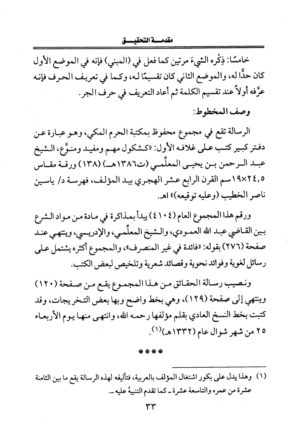ونصيب رسالة الحقائق من هذا المجموع يقع من صفحة (١٢٠) وينتهي إلى صفحة (١٢٩)، وهي بخط واضح وبها بعض التخريجات، وقد كتبت بخط النسخ العادي بقلم مؤلفها رحمه الله، وانتهى منها يوم الأربعاء ٢٥ من شهر شوال عام (١٣٣٢ هـ) (¬١).