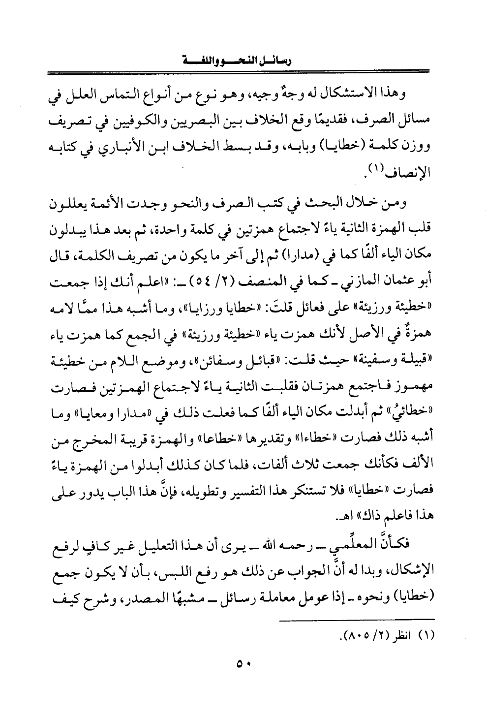 وهذا الاستشكال له وجهٌ وجيه، وهو نوع من أنواع التماس العلل في مسائل الصرف، فقديمًا وقع الخلاف بين البصريين والكوفيين في تصريف ووزن كلمة (خطايا) وبابه، وقد بسط الخلاف ابن الأنباري في كتابه الإنصاف (¬١).
