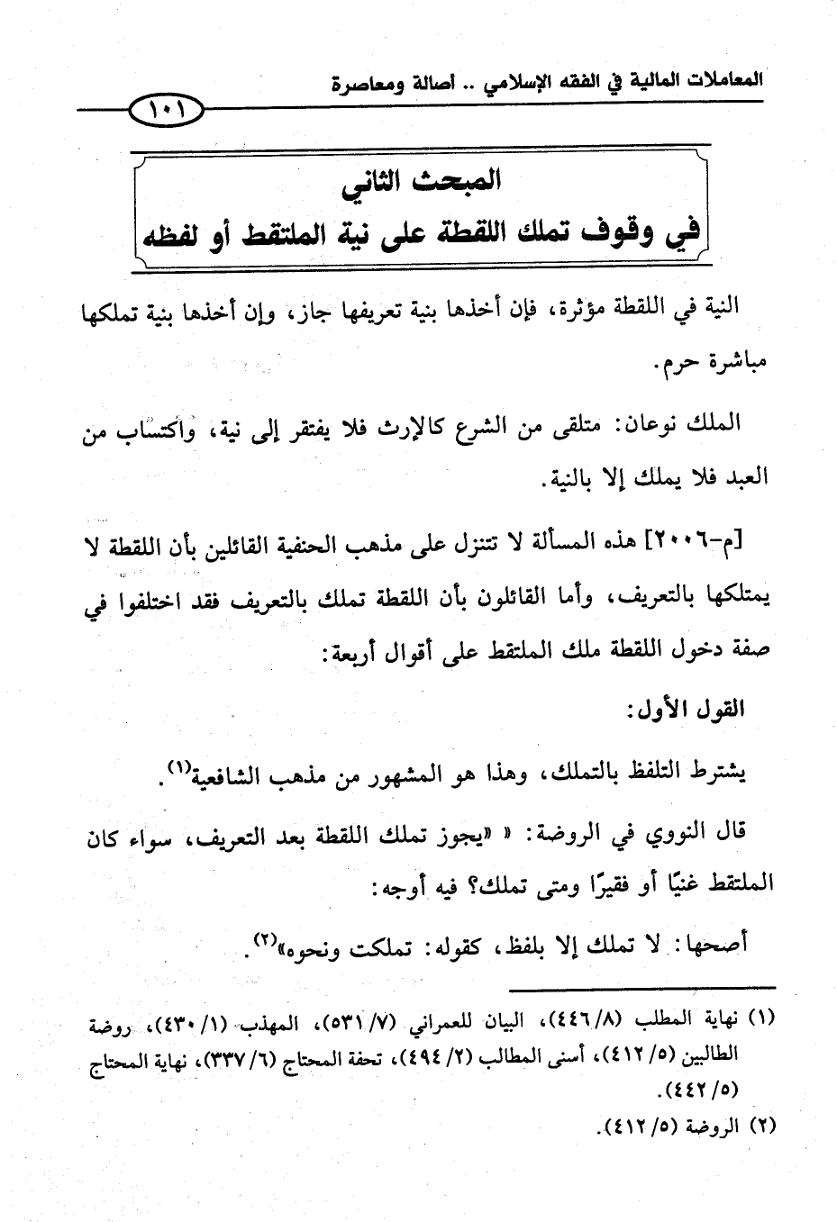 المبحث الثاني في وقوف تملك اللقطة على نية الملتقط أو لفظه