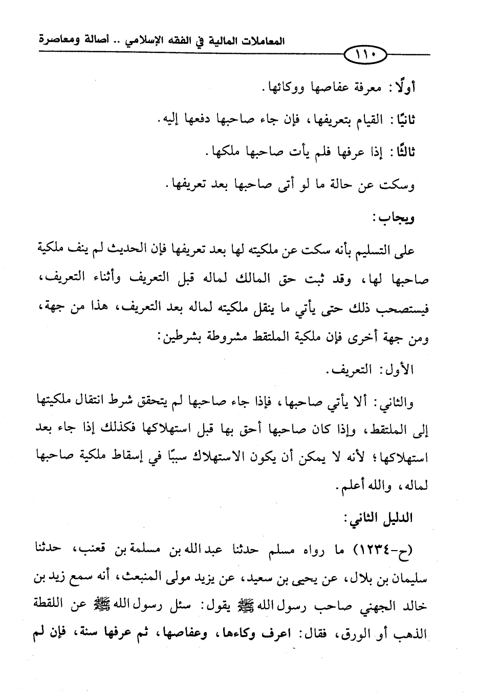 (ح - ١٢٣٤) ما رواه مسلم حدثنا عبد الله بن مسلمة بن قعنب، حدثنا سليمان بن بلال، عن يحيى بن سعيد، عن يزيد مولى المنبعث، أنه سمع زيد بن خالد الجهني صاحب رسول الله - صلى الله عليه وسلم - يقول: سئل رسول الله - صلى الله عليه وسلم - عن اللقطة الذهب أو الورق، فقال: اعرف وكاءها، وعفاصها، ثم عرفها سنة، فإن لم