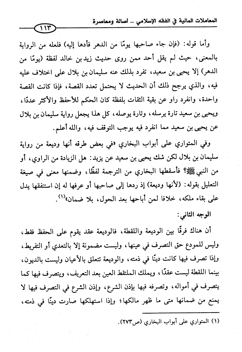 وفي المتواري على أبواب البخاري "في بعض طرقه أنها وديعة من رواية سليمان بن بلال لكن شك يحيى بن سعيد عن يزيد: هل الزيادة من الراوي، أو من النبي - صلى الله عليه وسلم -؟ فأسقطها البخاري من الترجمة لفظًا، وضمنها معنى في صيغة التعليل بقوله: (لأنها وديعة) إذ ردها إلى صاحبها أو عرفها له إن استنفقها يدل على بقاء ملكه، خلافا لمن أباحها بعد الحول، بلا ضمان" (¬١).