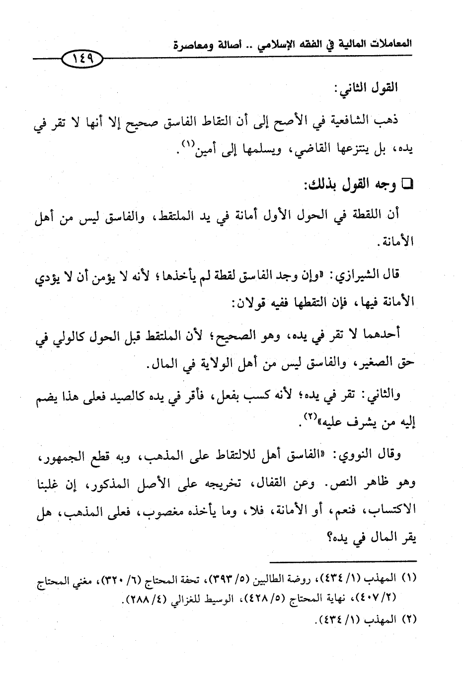 وقال النووي: "الفاسق أهل للالتقاط على المذهب، وبه قطع الجمهور، وهو ظاهر النص. وعن القفال، تخريجه على الأصل المذكور، إن غلبنا الاكتساب، فنعم، أو الأمانة، فلا، وما يأخذه مغصوب، فعلى المذهب، هل يقر المال في يده؟