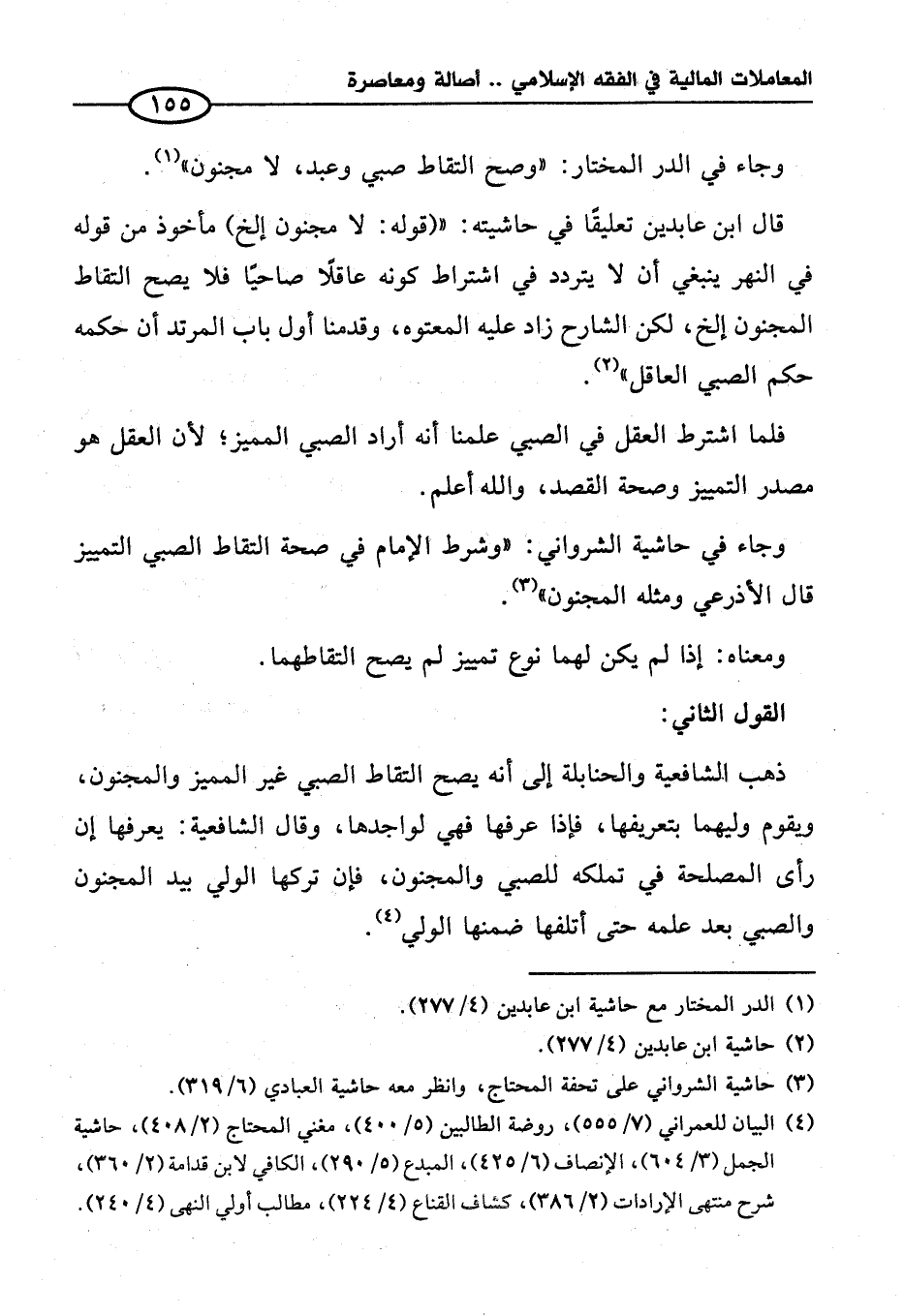 قال ابن عابدين تعليقًا في حاشيته: " (قوله: لا مجنون إلخ) مأخوذ من قوله في النهر ينبغي أن لا يتردد في اشتراط كونه عاقلًا صاحيًا فلا يصح التقاط المجنون إلخ، لكن الشارح زاد عليه المعتوه، وقدمنا أول باب المرتد أن حكمه حكم الصبي العاقل" (¬٢).