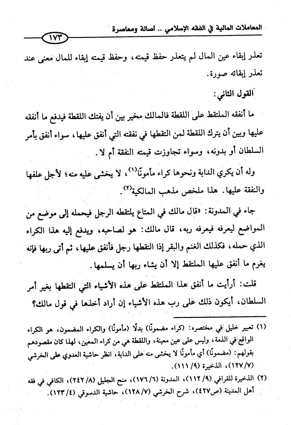 (¬١) تعبير خليل في مختصره: (كراء مضمونًا) بدلًا (مأمونًا) والكراء المضمون، هو الكراء الواقع في الذمة، وليس على عين معينة، واللقطة هي من كراء المعين، لهذا كان مقصودهم بقولهم: (مضمونًا) أي مأمونًا لا يخشى منه على الدابة، انظر حاشية العدوي على الخرشي (٧/ ١٢٧)، الذخيرة (٩/ ١١١).